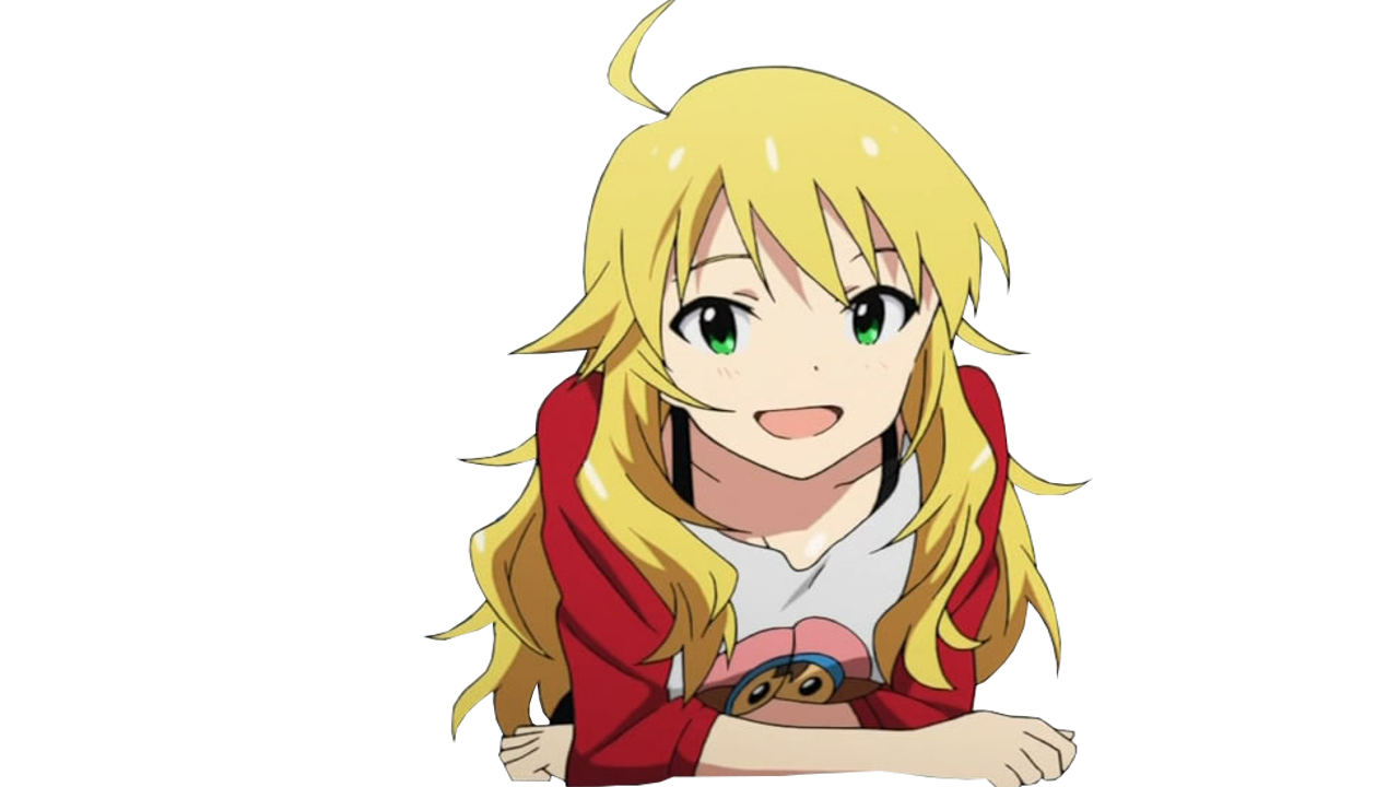 Description: A blonde haired girl with long hair and green eyes sitting on a black background with her arms crossed and her hand on her chest.