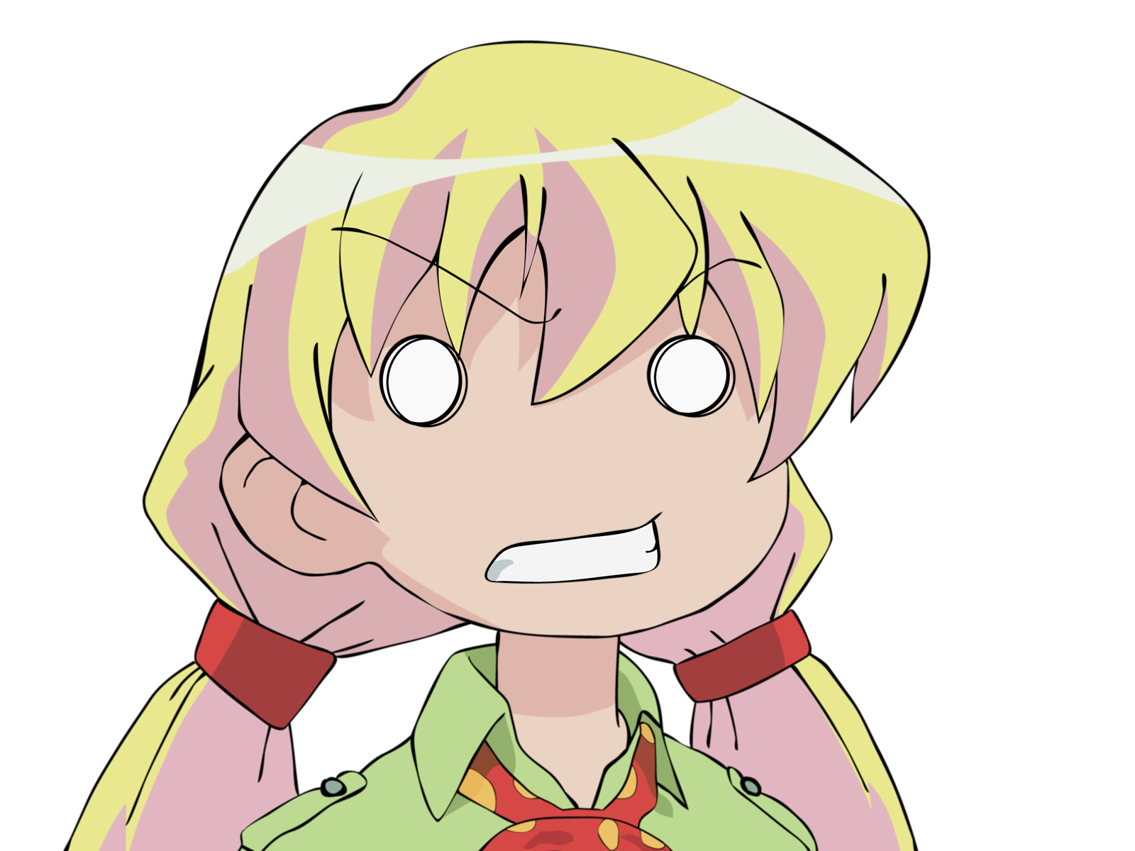 Description: A cartoon character with blonde hair and a green shirt with a red tie on it's neck and a green shirt with a red tie on it's neck.