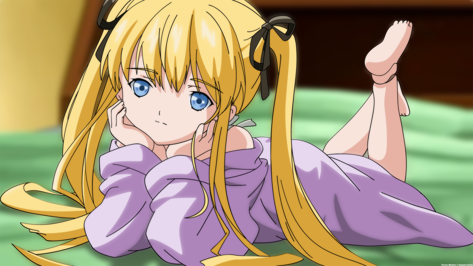 Description: A blonde haired girl laying on her stomach with her legs crossed and her head resting on her hand.