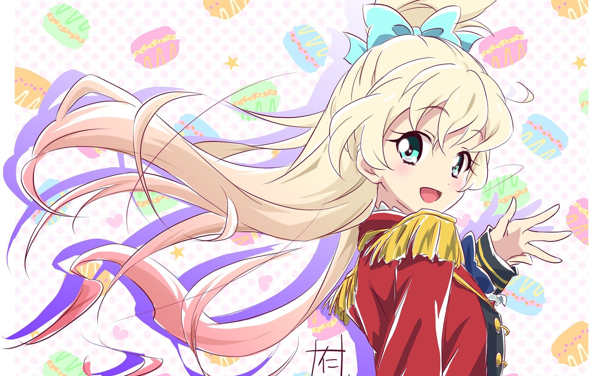 Description: A blonde haired girl with long hair and a bow in her hair.