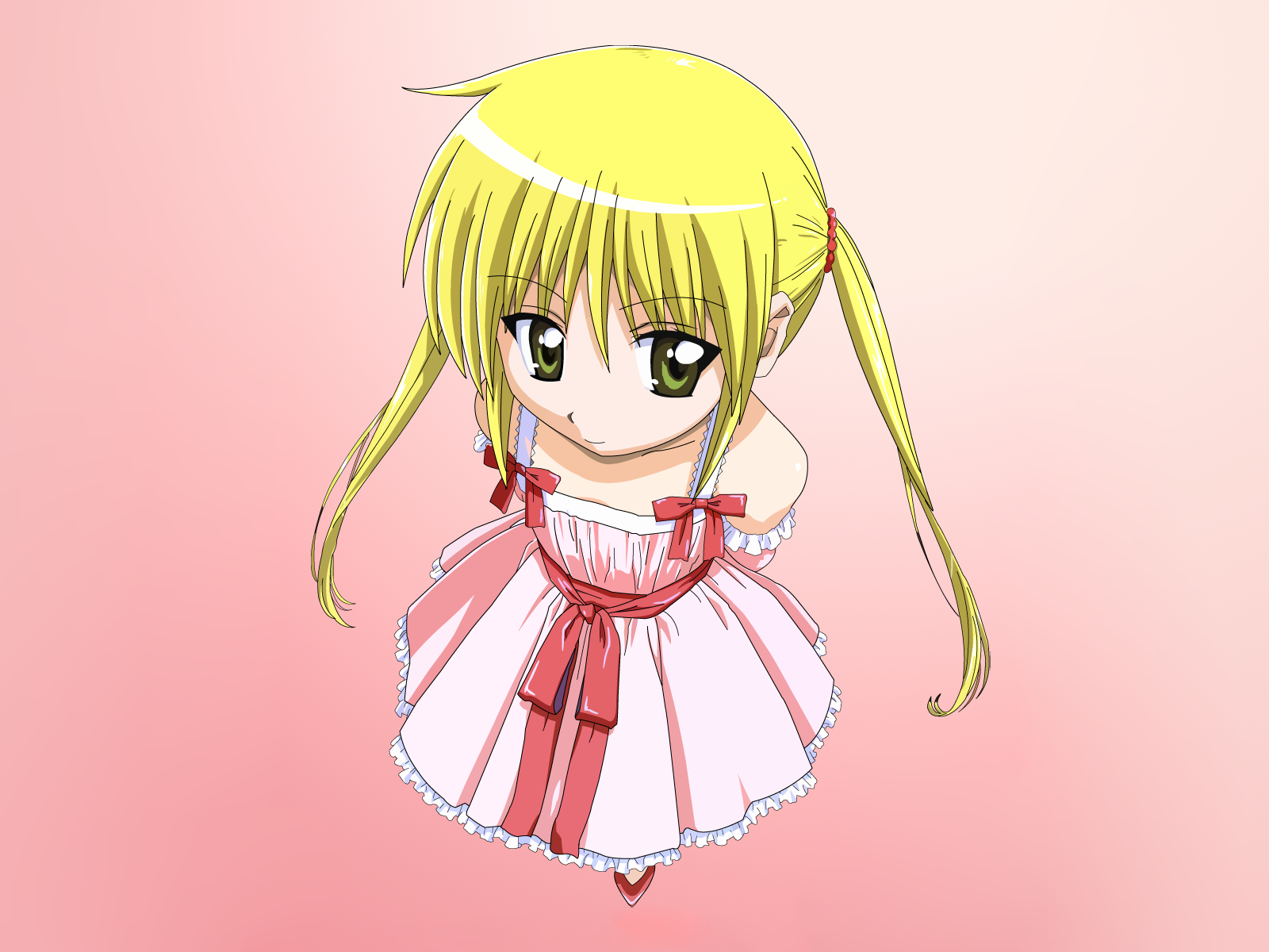 Description: A cartoon girl with blonde hair and green eyes wearing a pink dress and a red ribbon around her neck.