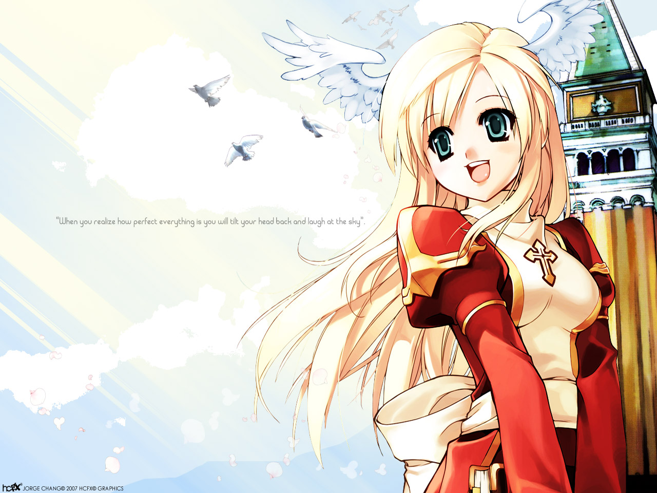 Description: A cartoon girl with long blonde hair and a red dress with a bird flying above her head and a castle in the background.