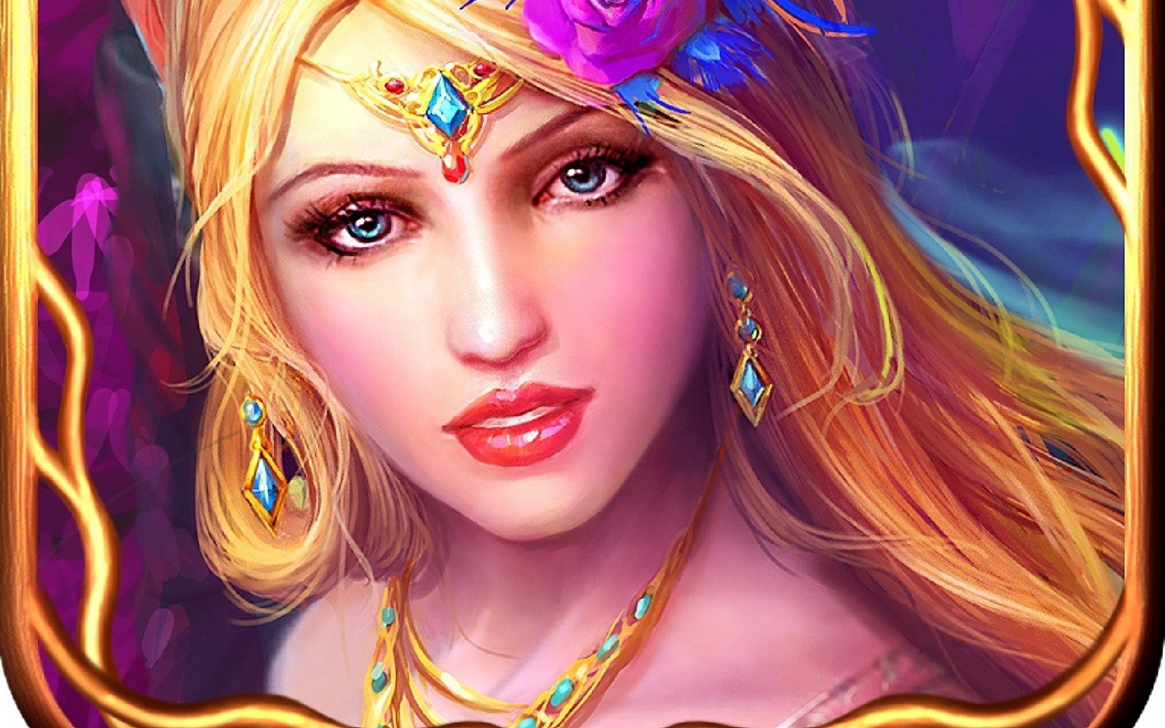 Description: A beautiful blonde girl with a rose in her hair and a necklace on her head.