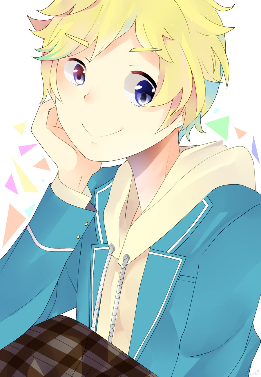 Description: A person with blonde hair and blue eyes holding a purse and looking at the camera with a serious look on his face.