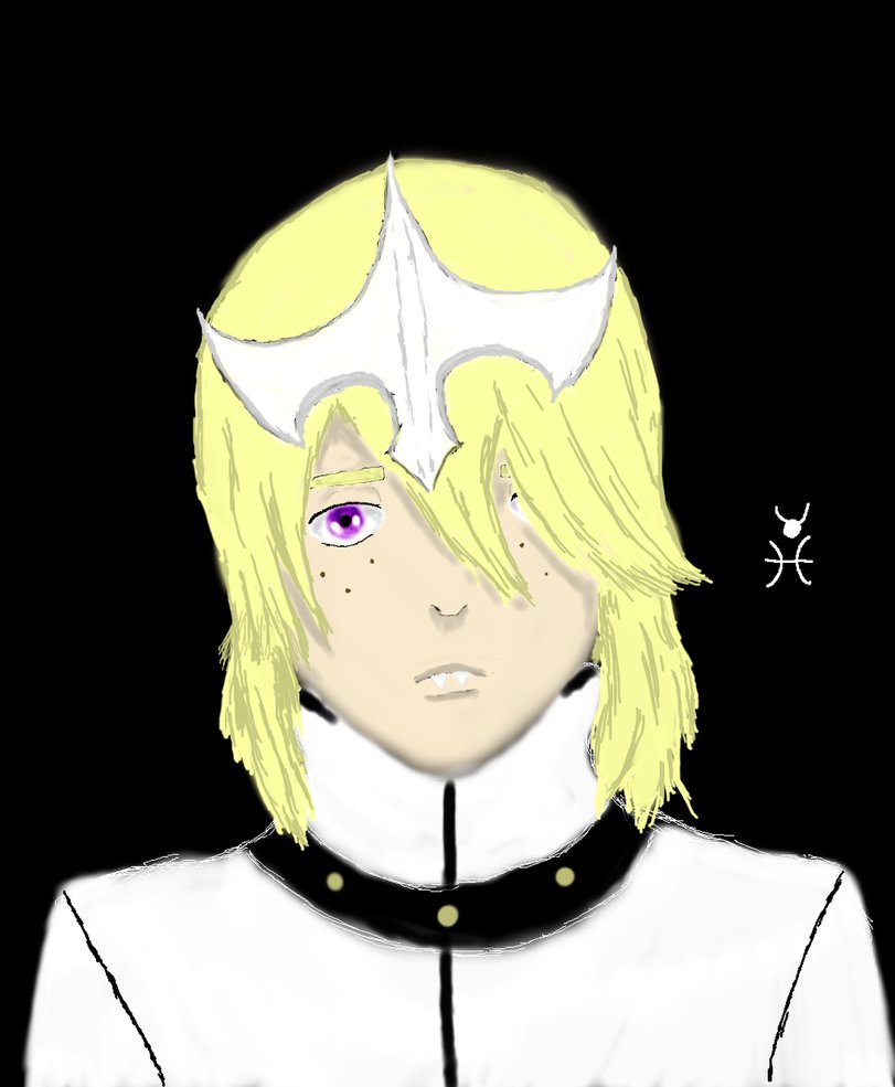 Description: A drawing of a man with blonde hair and a white shirt with a black collar and a white collar.