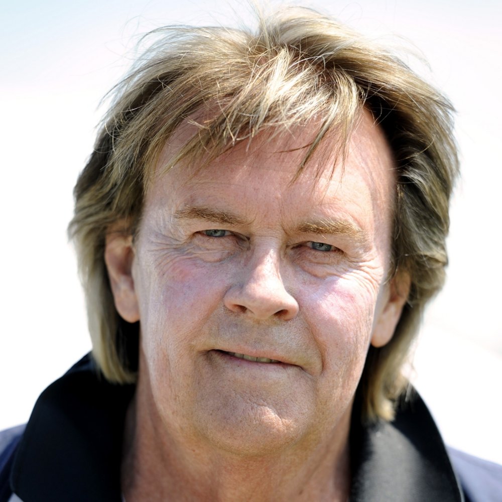 Description: A man with blonde hair and a black jacket on a sunny day with a blue sky in the background.