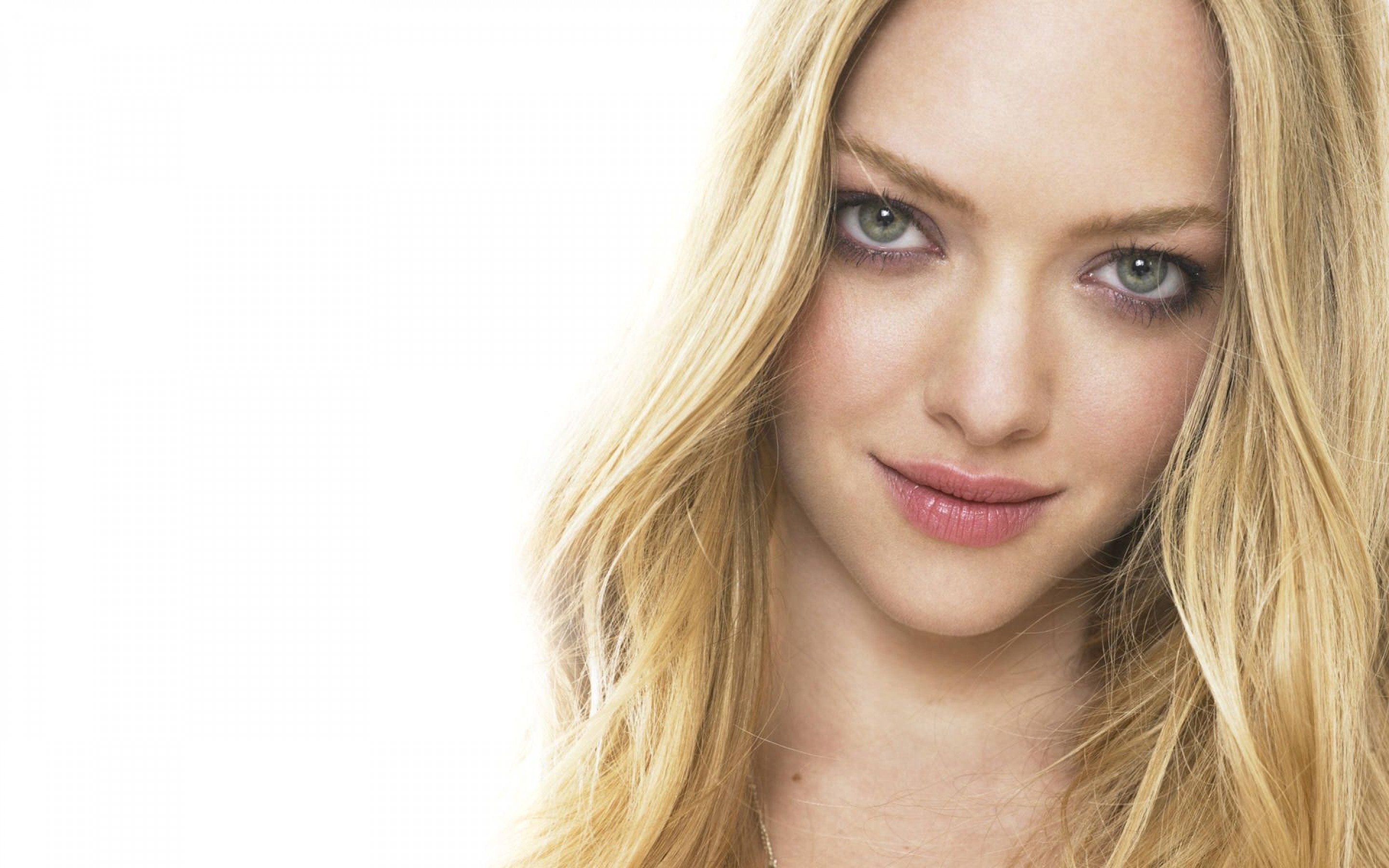 Description: A woman with long blonde hair and blue eyes posing for a picture with a white background and a necklace on.