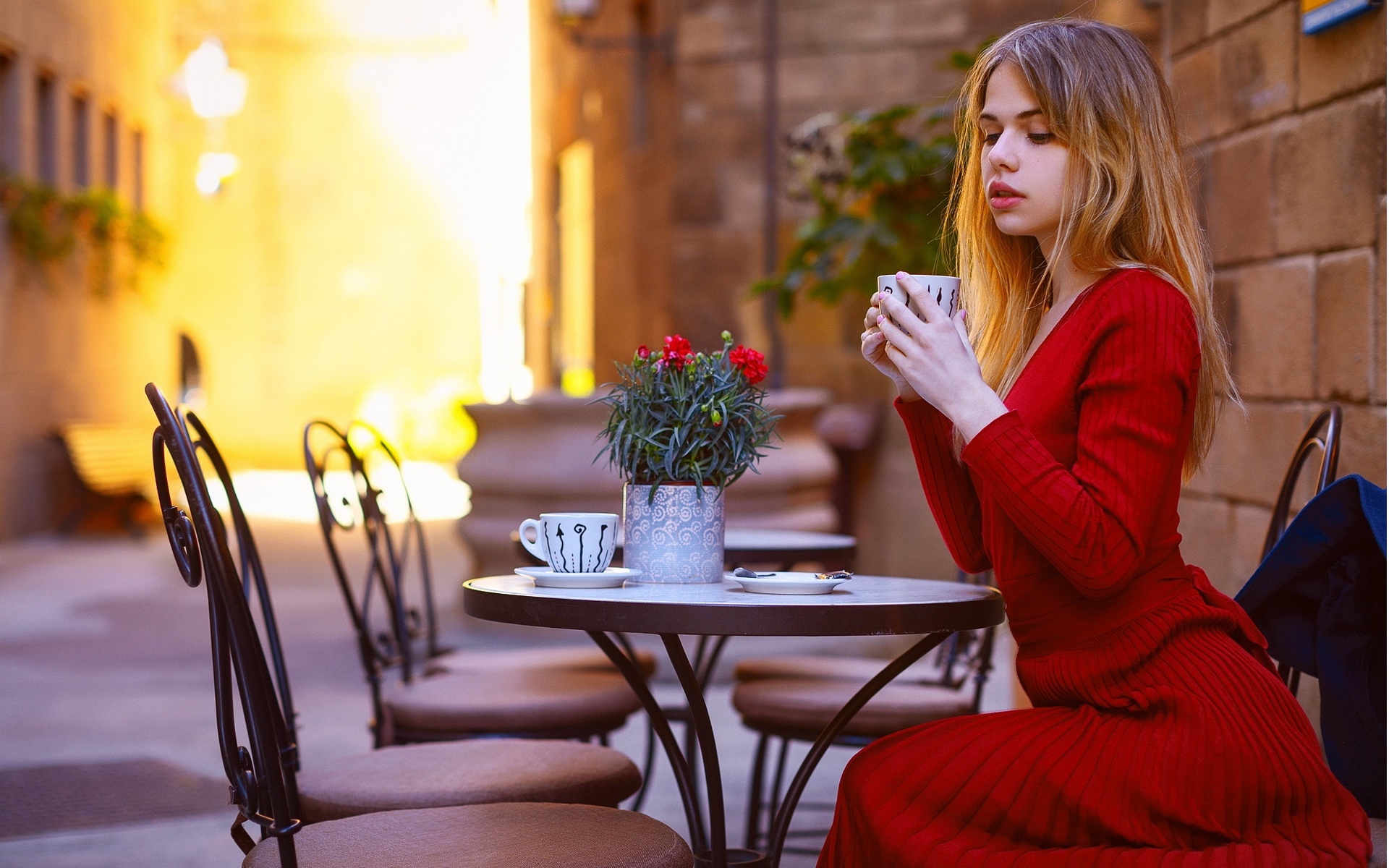 Description: A woman sitting at a table with a cup of coffee in her hand and a potted plant in the other hand.