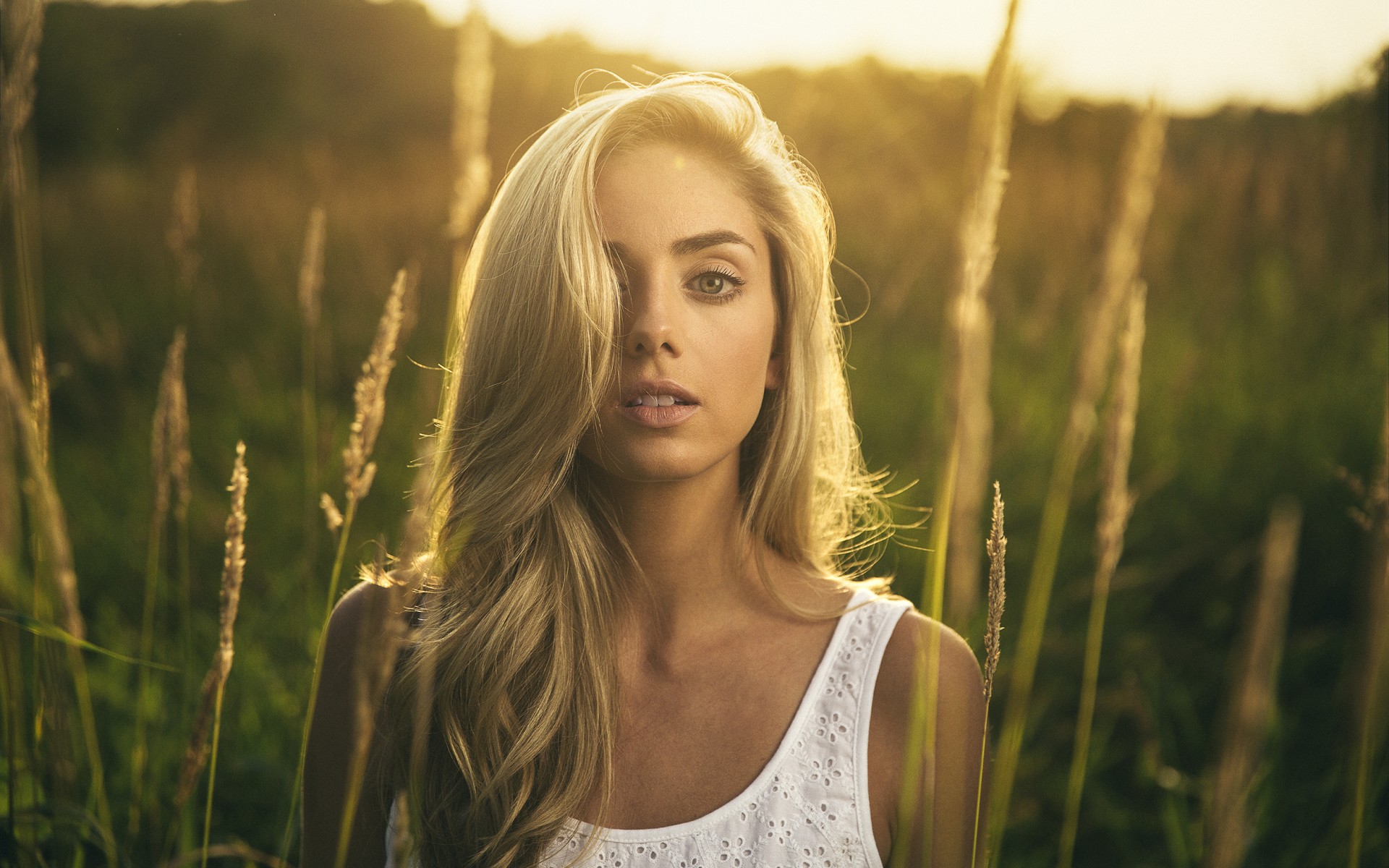 Description: A woman standing in a field of tall grass with her eyes closed and her hair blowing in the wind.