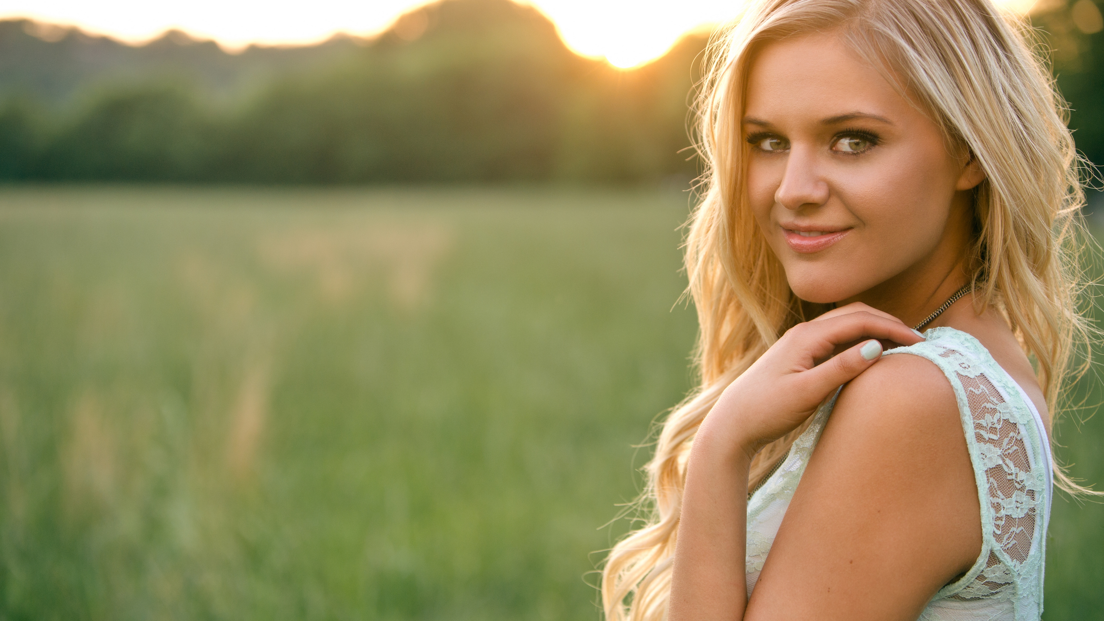 Description: A beautiful blond woman standing in a field of grass at sunset with her hands on her chest and her hand on her shoulder.