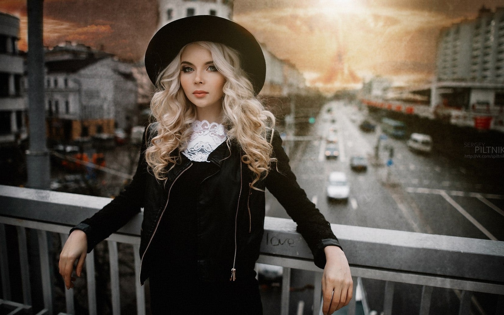 Description: A woman with long blonde hair wearing a black hat and black jacket standing on a balcony overlooking a city street.