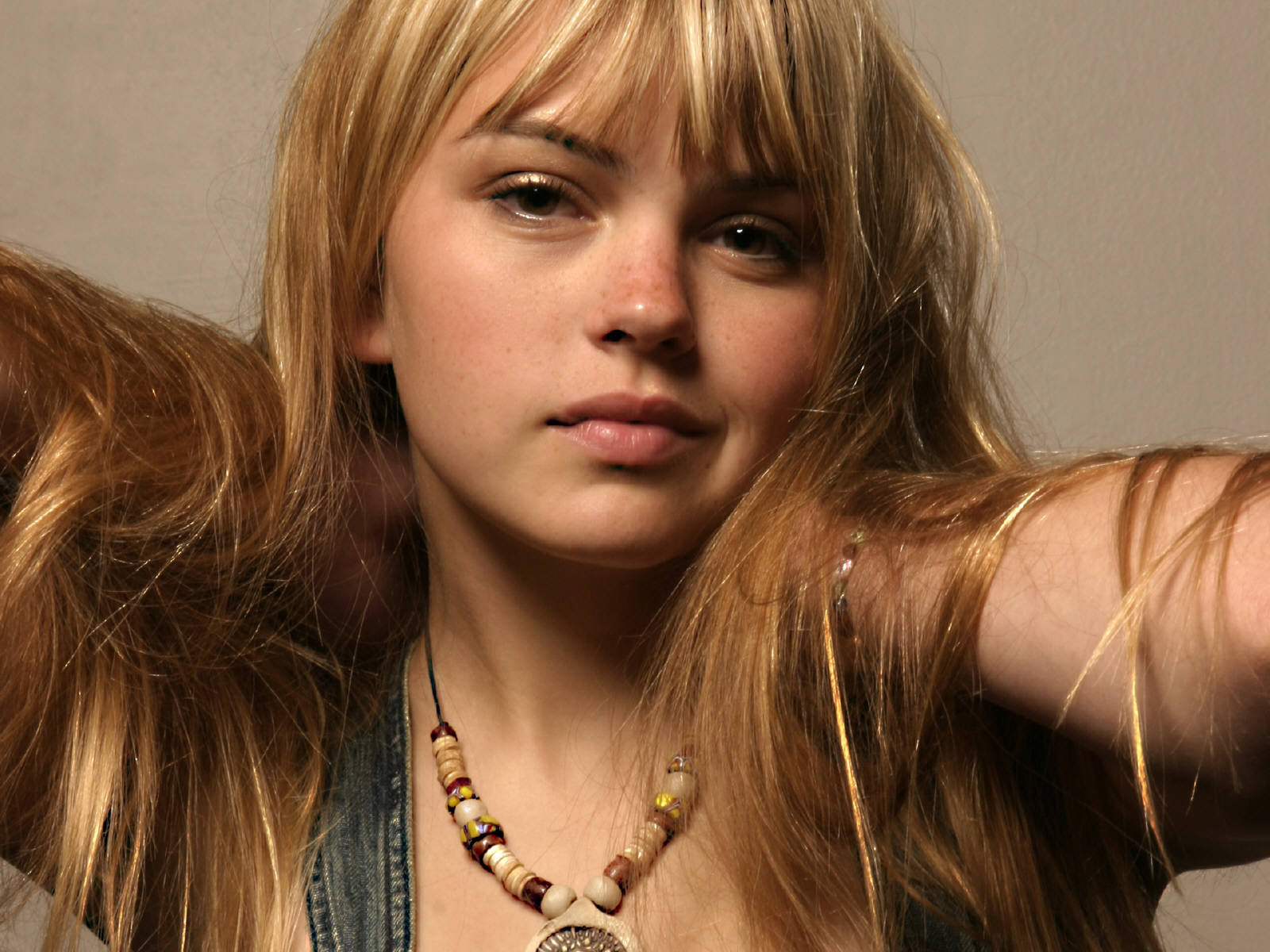Description: A woman with blonde hair and a necklace on her neck and a necklace on her shoulder with beads on it.