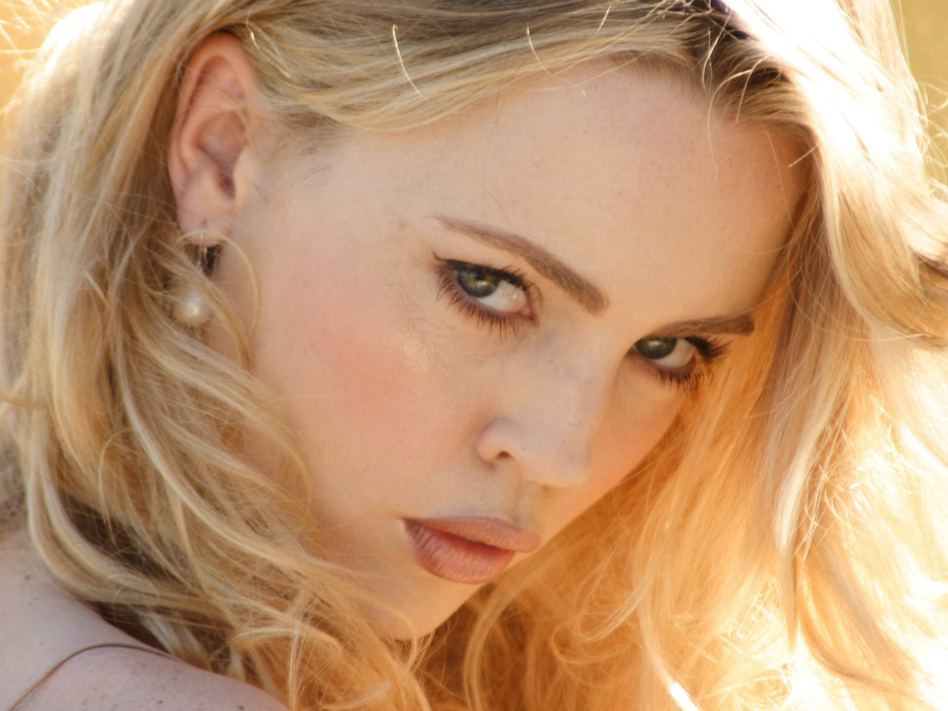 Description: A woman with blonde hair and a pink shirt is posing for a picture with her hair blowing in the wind.