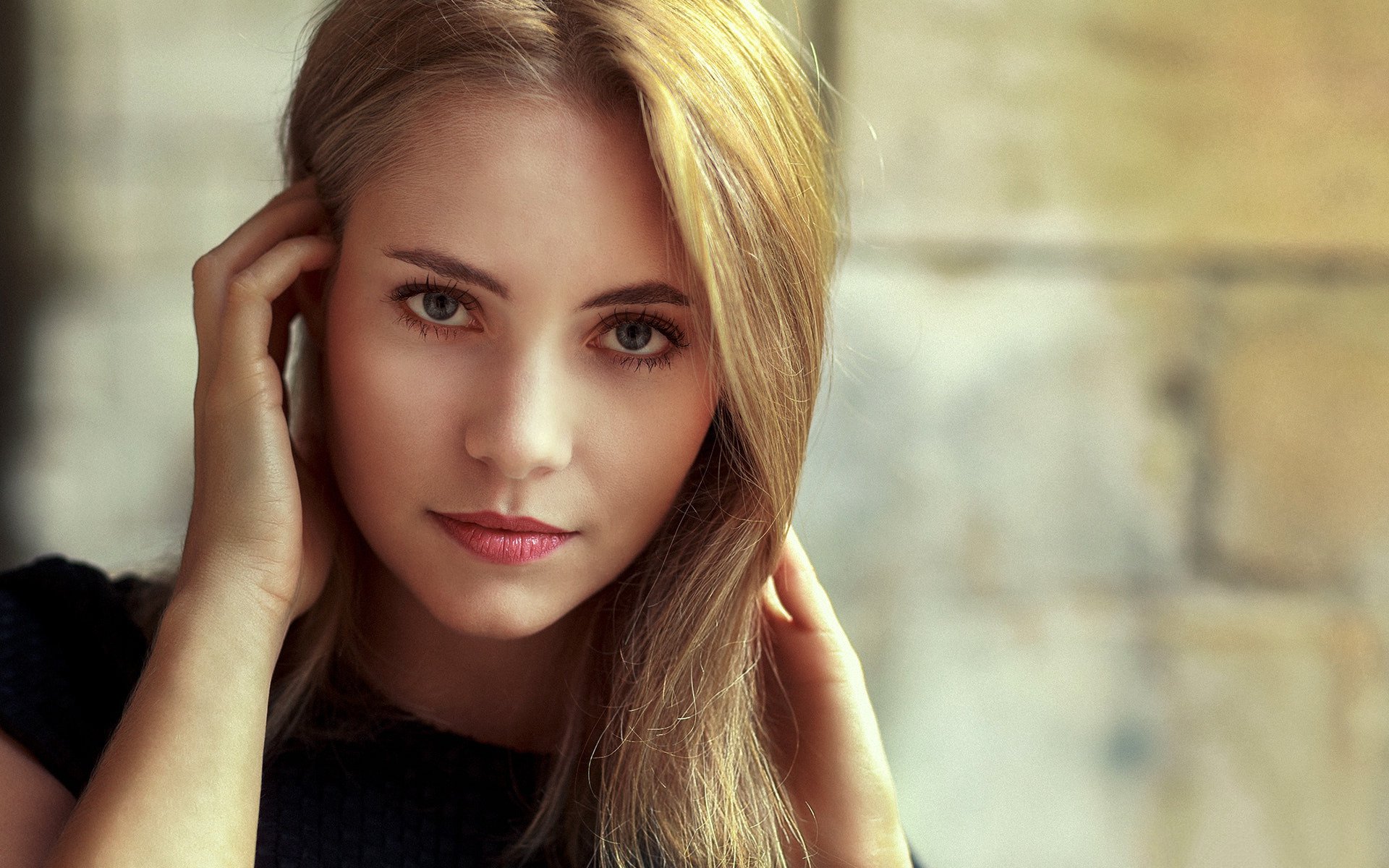 Description: A woman with blonde hair is posing for a picture with her hand on her head and her hand on her head.