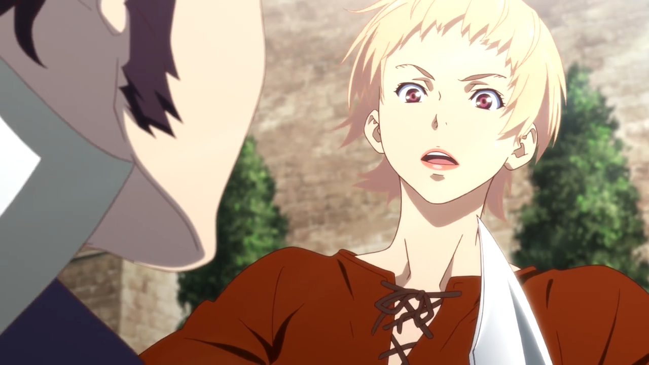 Description: A woman with blonde hair and a red shirt is looking at another woman with blonde hair and a red shirt.