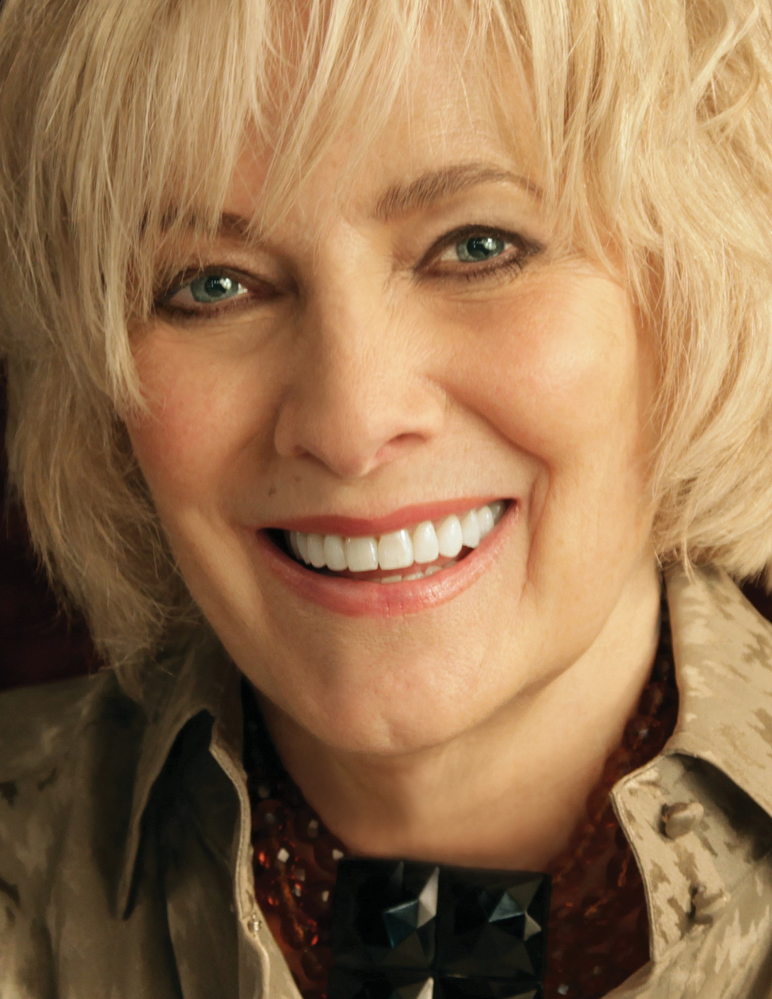 Description: A woman with blonde hair and a tie smiling at the camera with a smile on her face and a white shirt on.