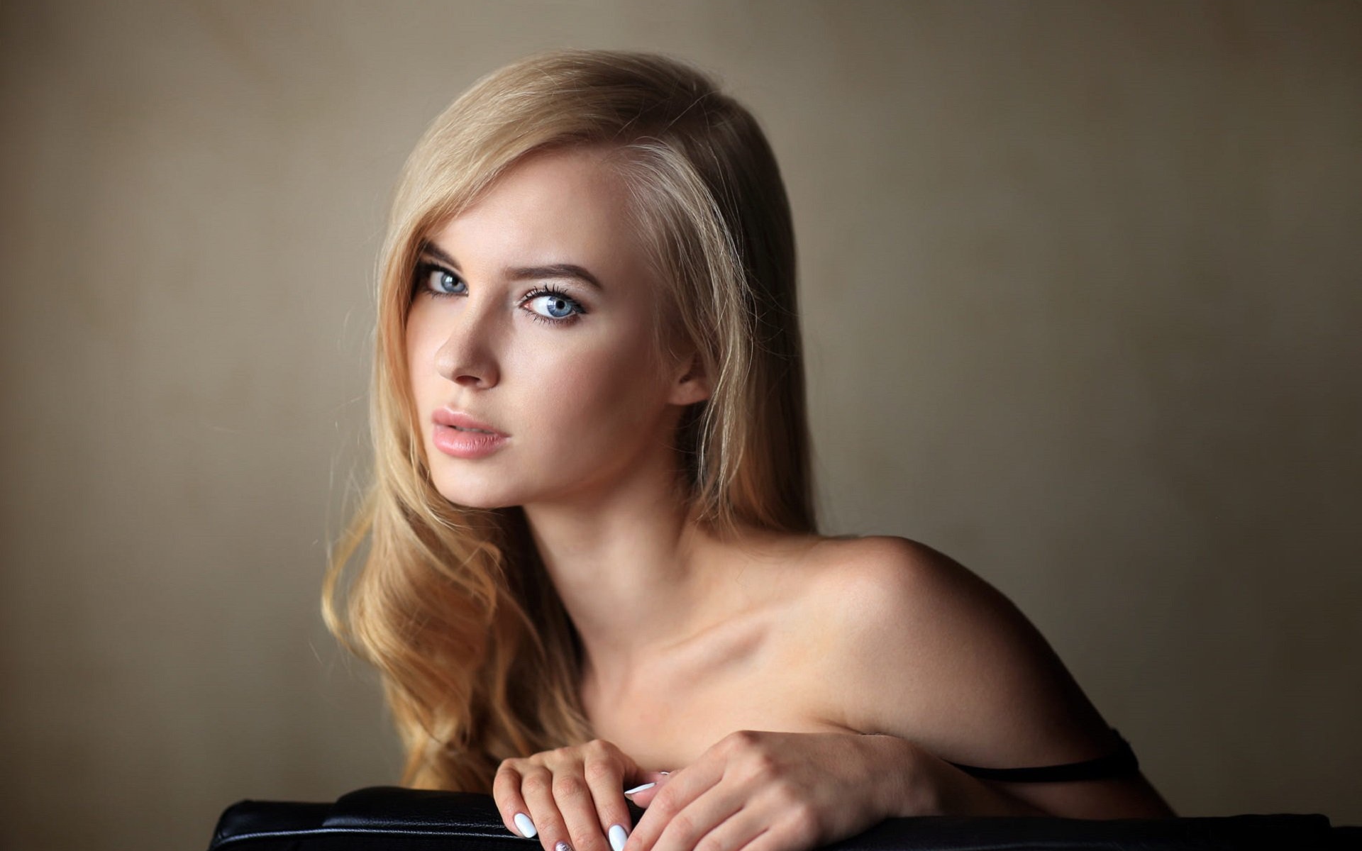 Description: A woman with long blonde hair posing for a picture with a suitcase in front of her and a hand on her shoulder.