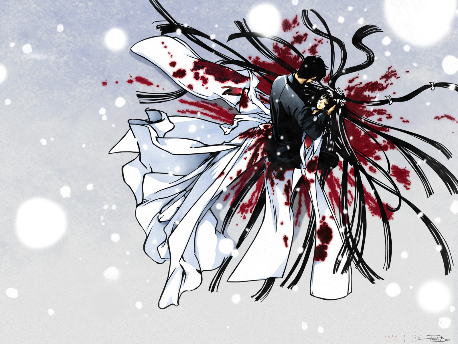 Description: A drawing of a woman with blood on her body and a dress with a bird on it.