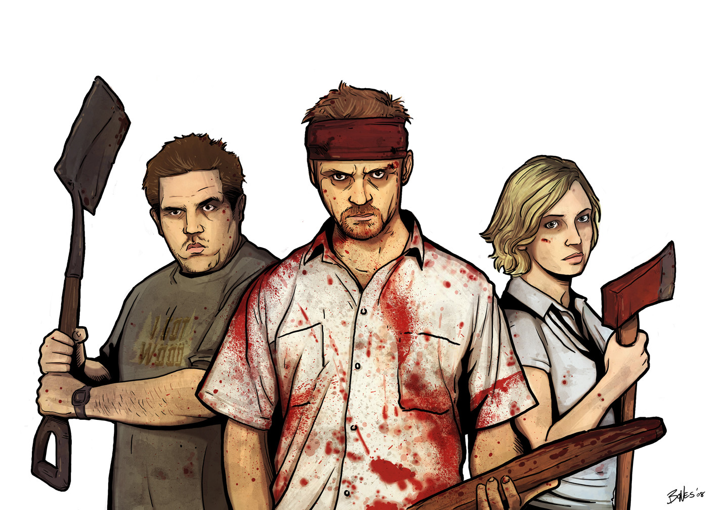 Description: A group of people with a bloody face holding a ax and a bloody knife and a bloody shirt on.