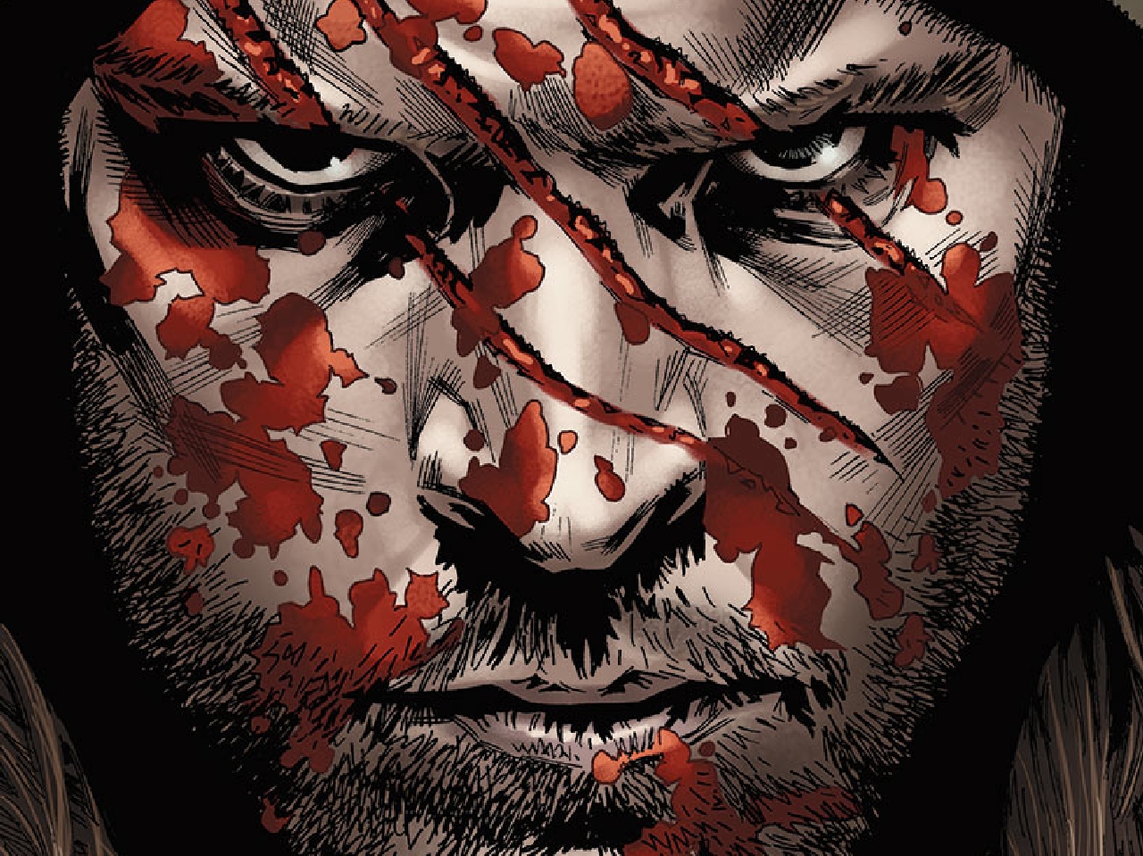 Description: A man with a bloody face and beard and a beard with blood on his face and eyes.