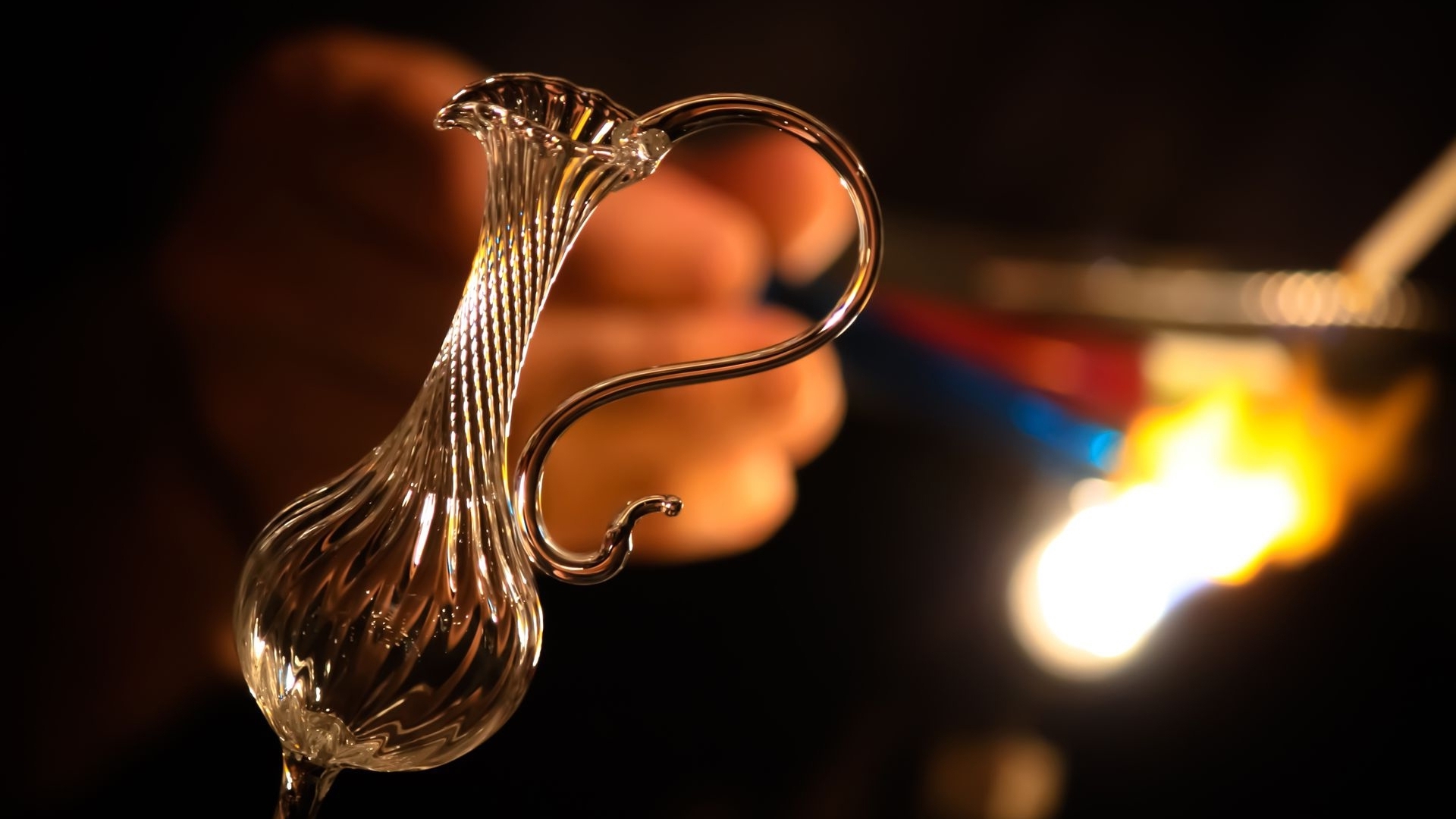 Description: A glass vase being blown by a person holding a lit candle in their hand and a lighter in the background.