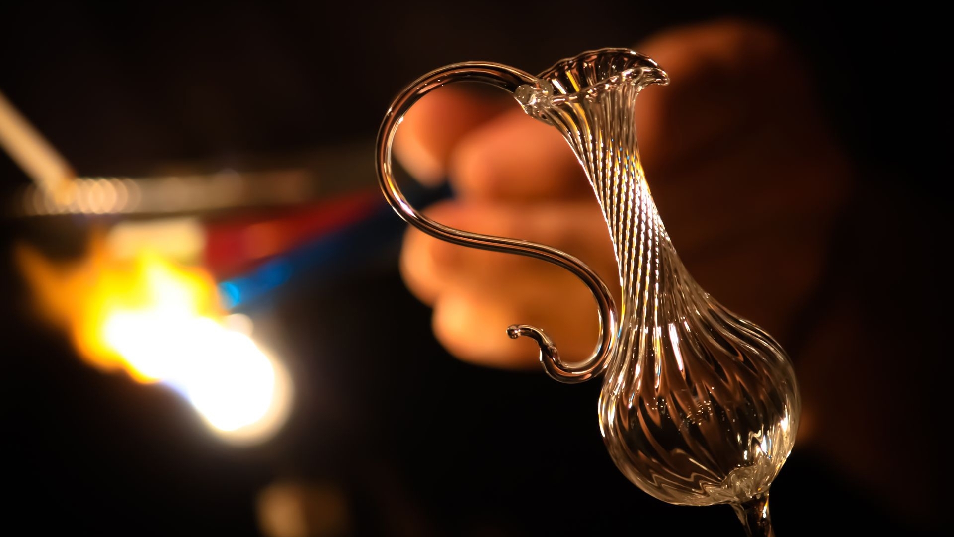 Description: A glass vase being blown by a person holding a lighter in their hand.