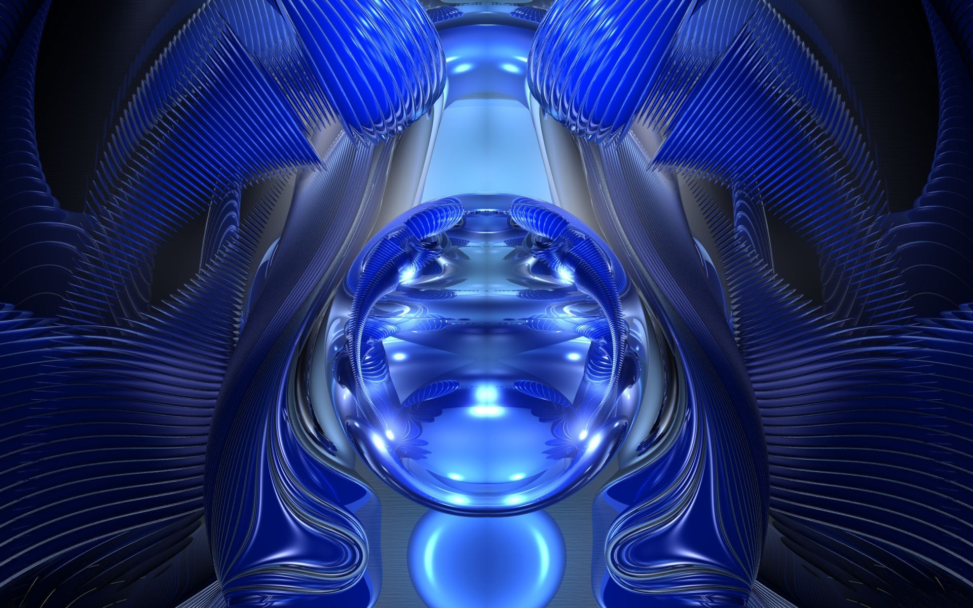Description: A blue abstract background with a large circular object in the center of the image and a smaller circular object in the middle of the image.