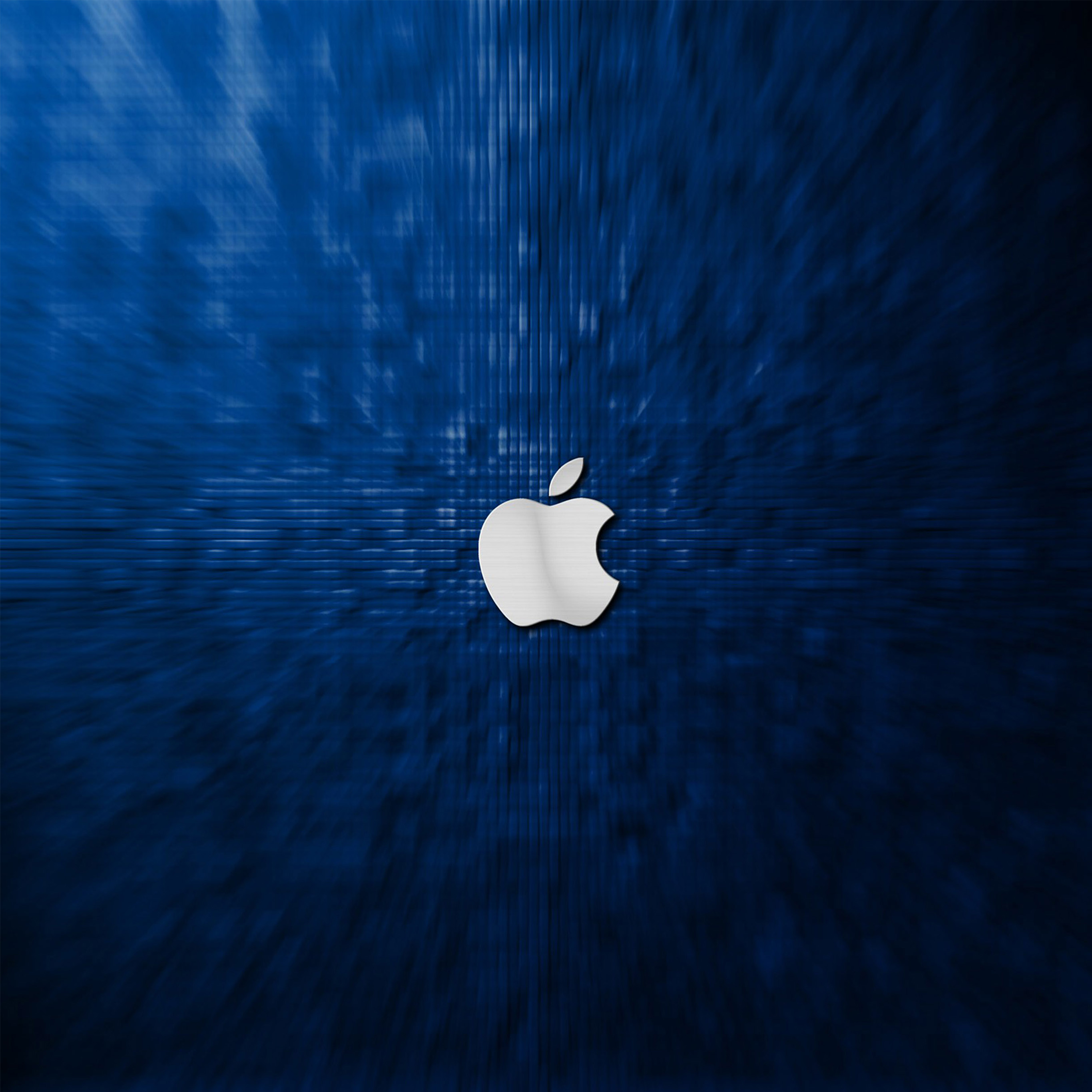 Description: A blue apple logo on a blue background with a blurry effect of lines and dots in the background.
