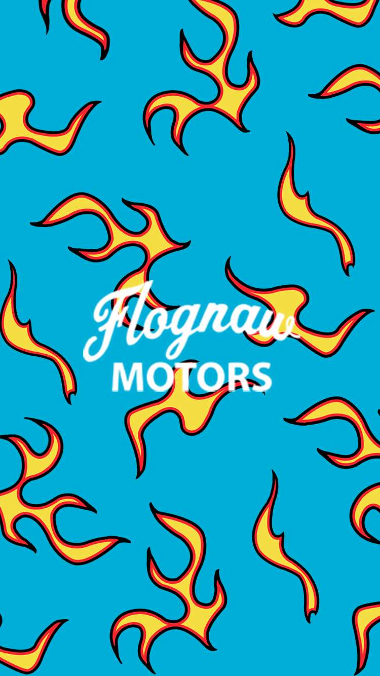 Description: A blue background with yellow and red flames and the words kognwa motors on it in white lettering.