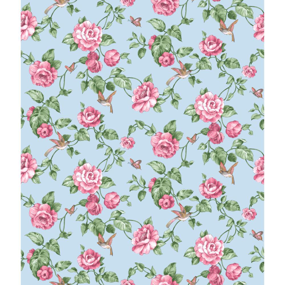 Description: A blue background with pink roses and a hummingbird on it's side and a green leafy branch.