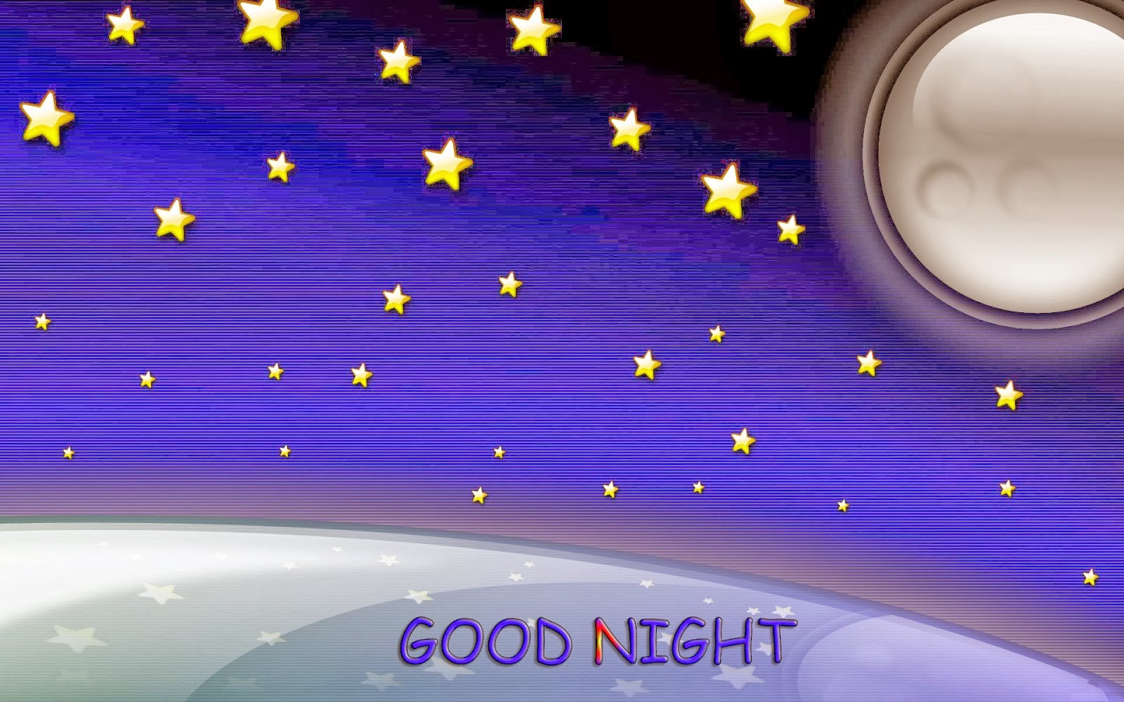 Description: A blue background with stars and a clock with the words good night written below it and a full moon.