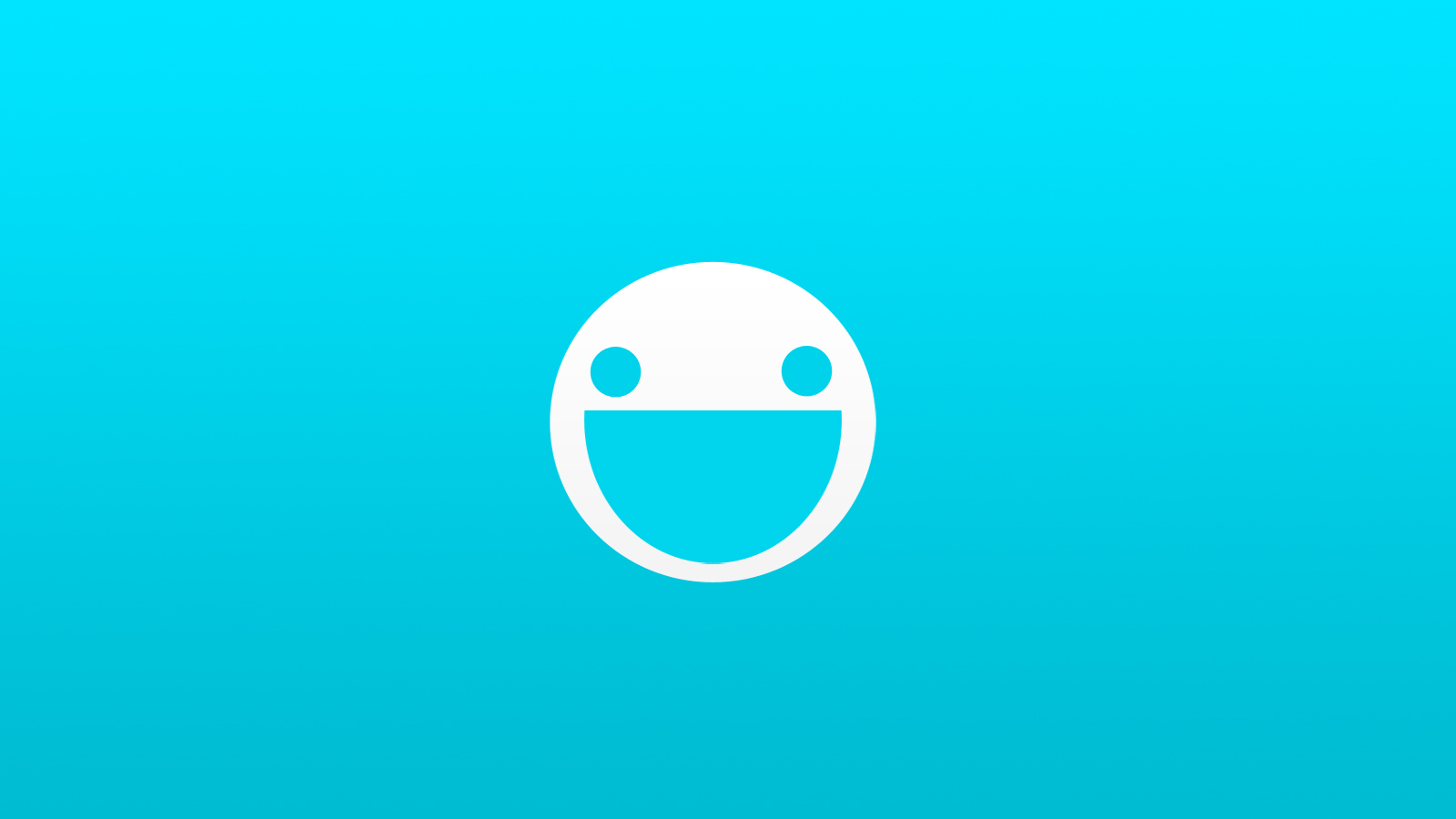 Description: A blue background with a white face on it's side and a white smiley face on the other side.