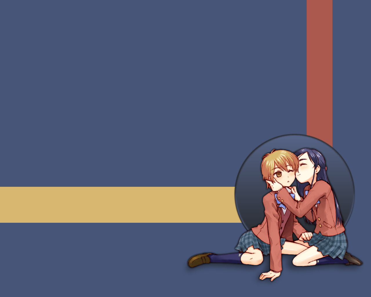 Description: A couple of people sitting on the ground next to each other with a blue background and a yellow stripe.