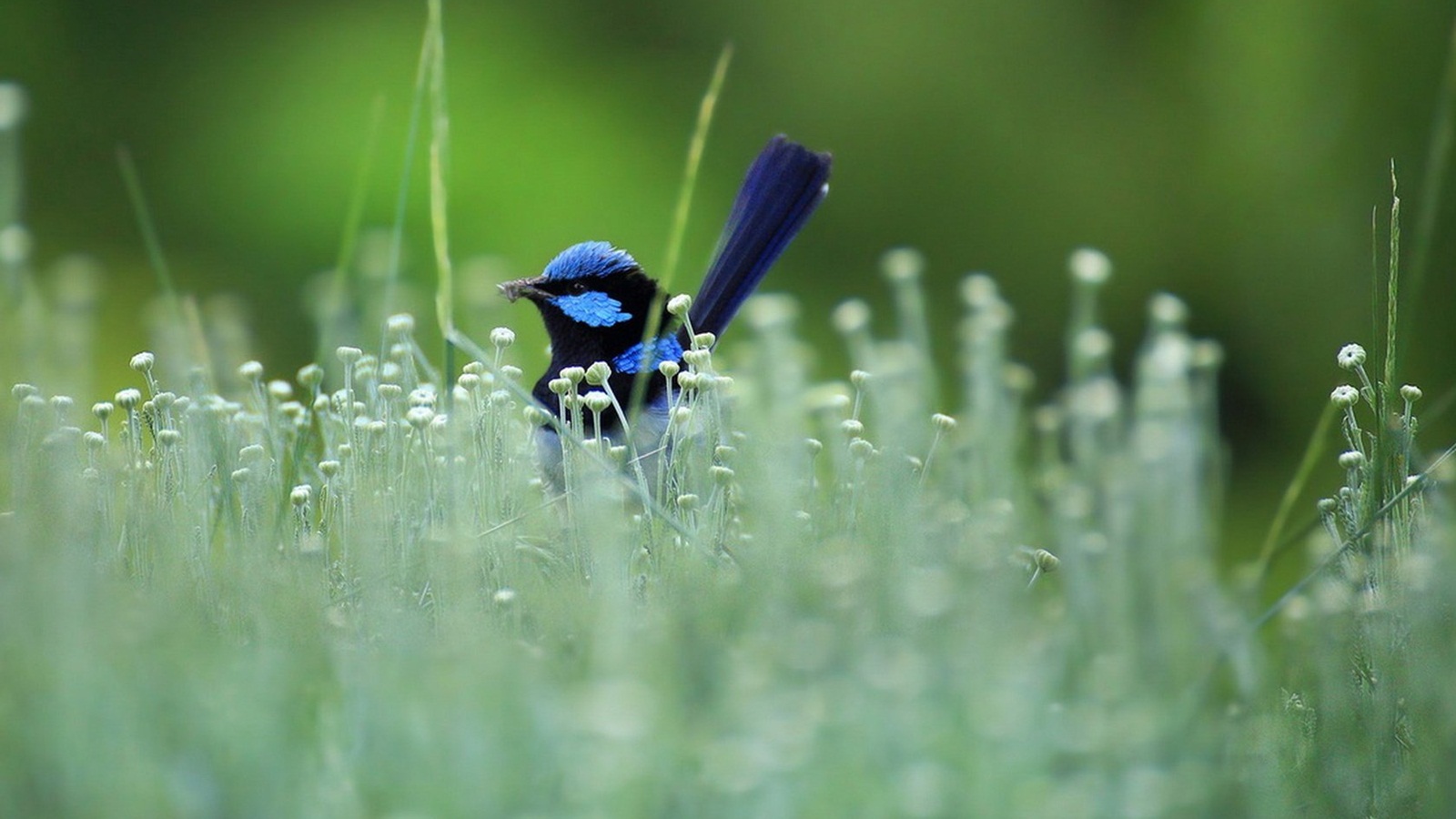 Description: A blue bird with a black head and tail sitting in a field of grass and flowers with dew drops on the grass.