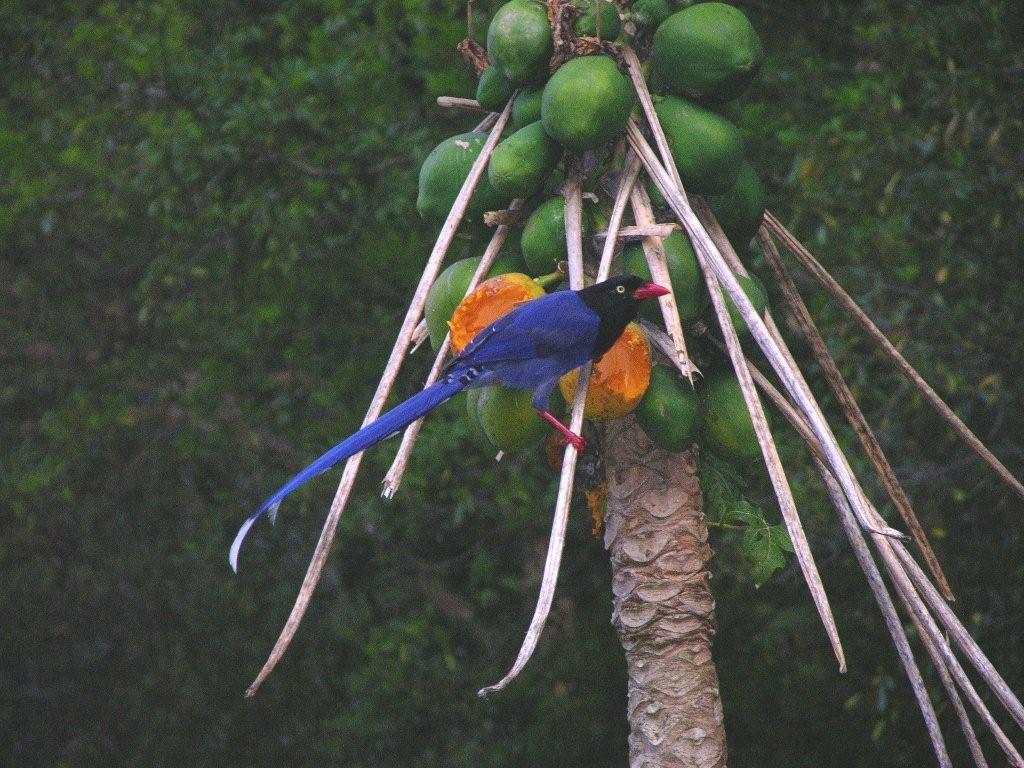 Description: A blue bird sitting on top of a tree next to a bunch of fruit on a tree branch with green leaves.