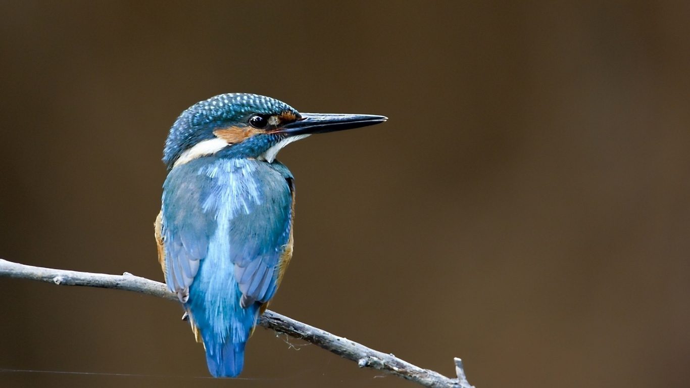 Description: A blue bird with a white chest sitting on a branch with a brown background and a small branch with a small bird on it.
