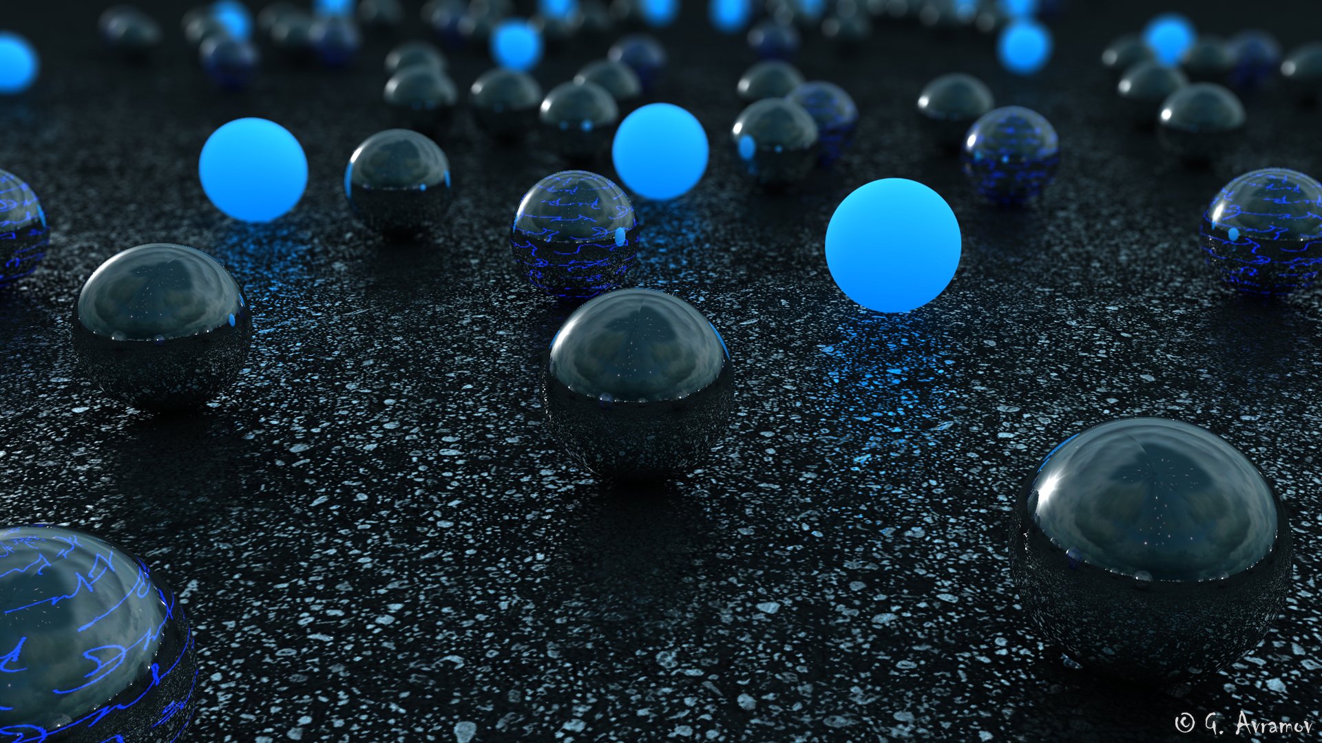 Description: A group of blue and black balls on a black surface with a blue light shining on them and a black background.