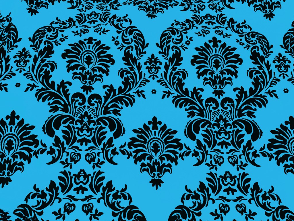 Description: A blue and black wallpaper with a pattern of flowers and leaves on it.