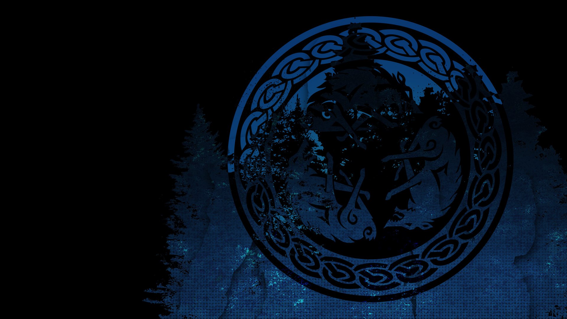 Description: A blue and black picture of a person in a circle with trees in the background and a blue background.