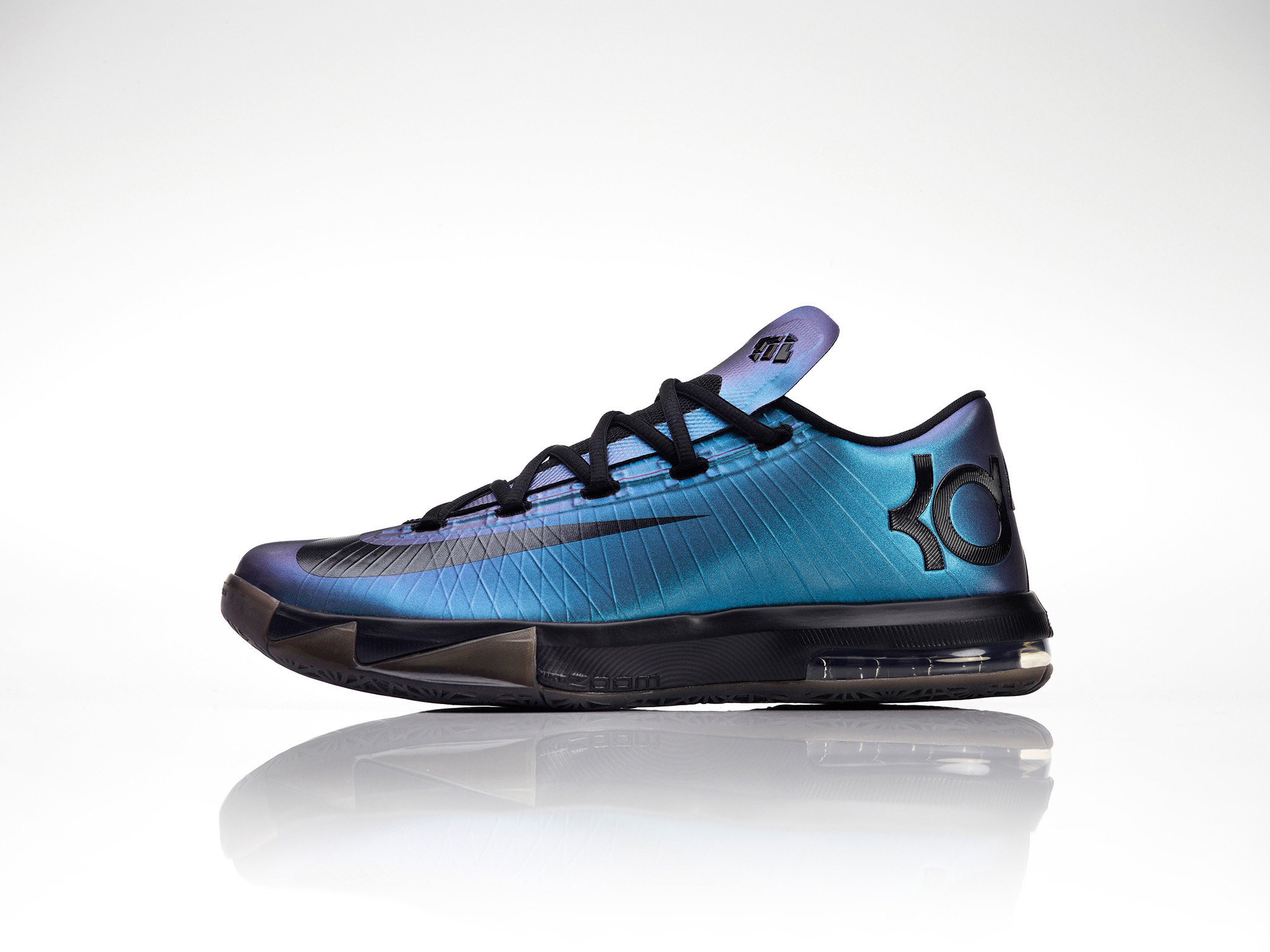Description: A blue and black shoe with a white background and a reflection on the floor of the shoe.
