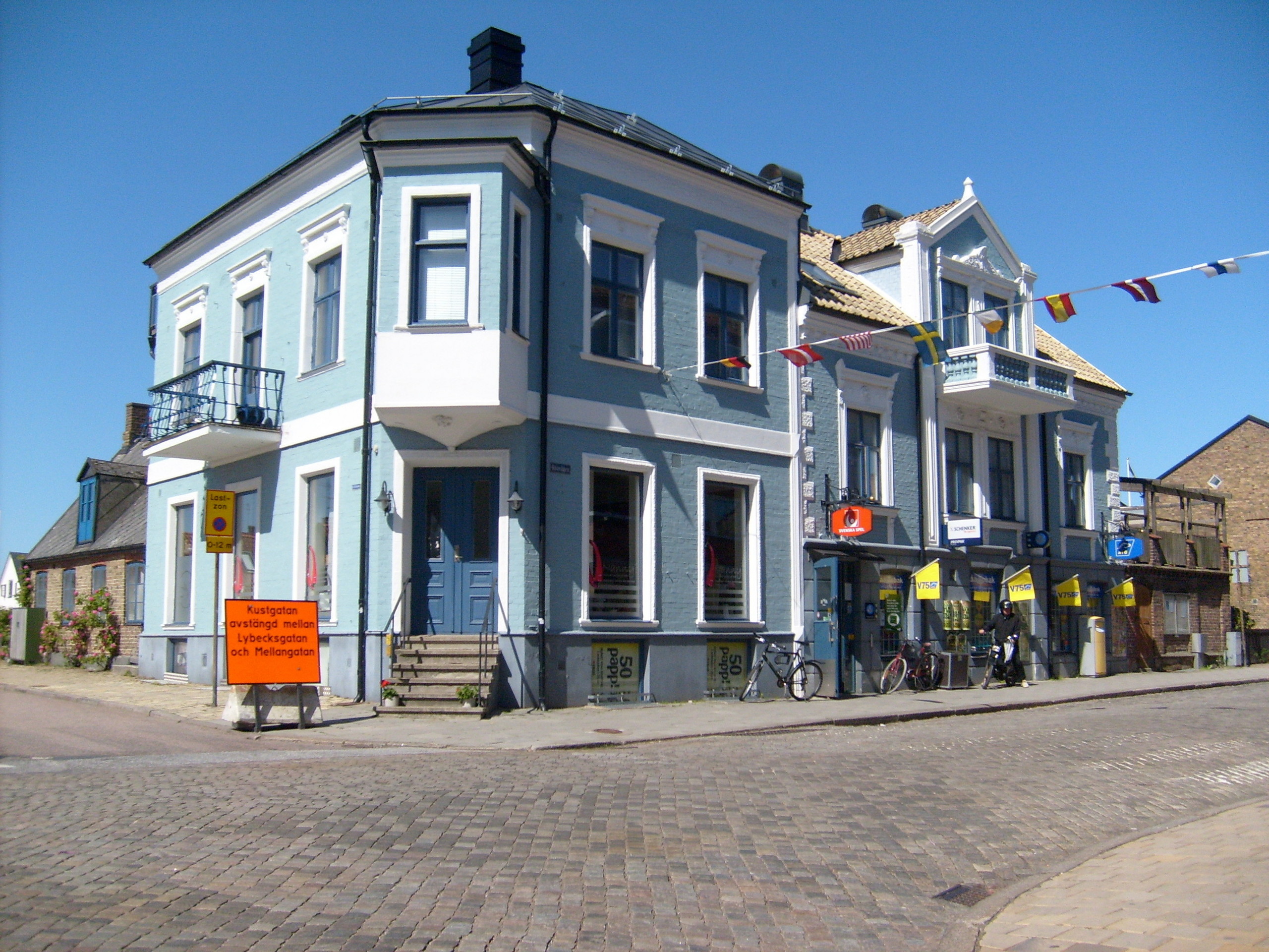 Description: A blue building with a bicycle parked in front of it on a street corner with a red sign in front of it.