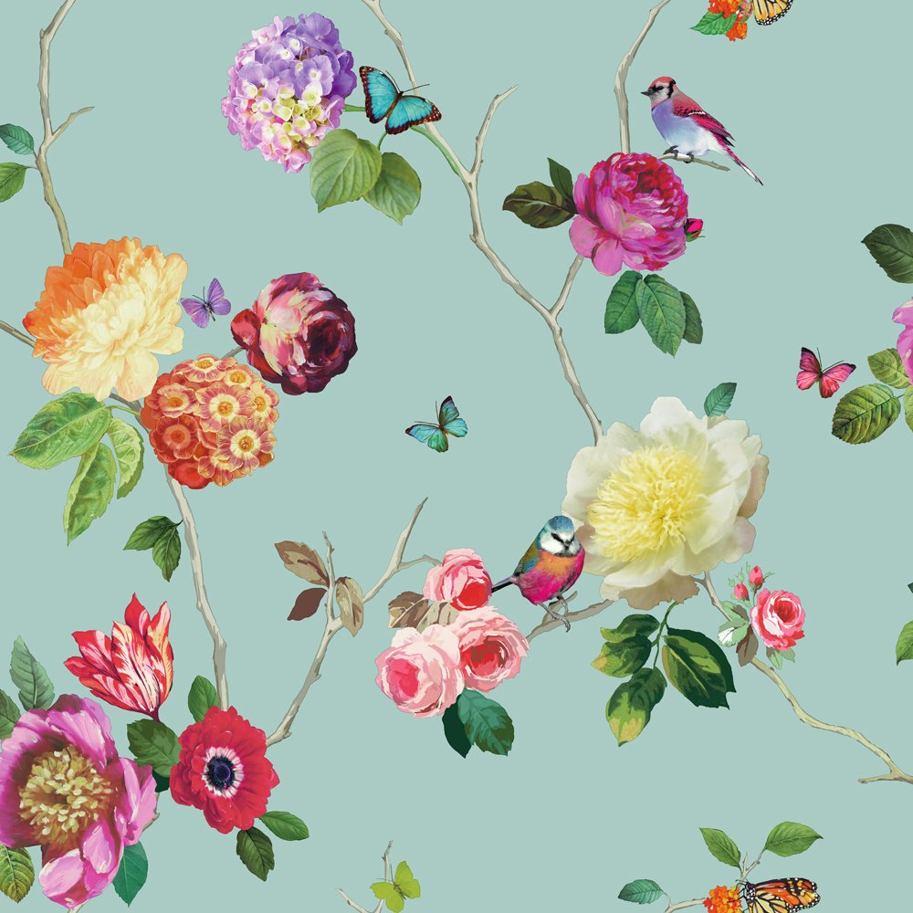 Description: A blue background with a bunch of flowers and a butterfly on it.