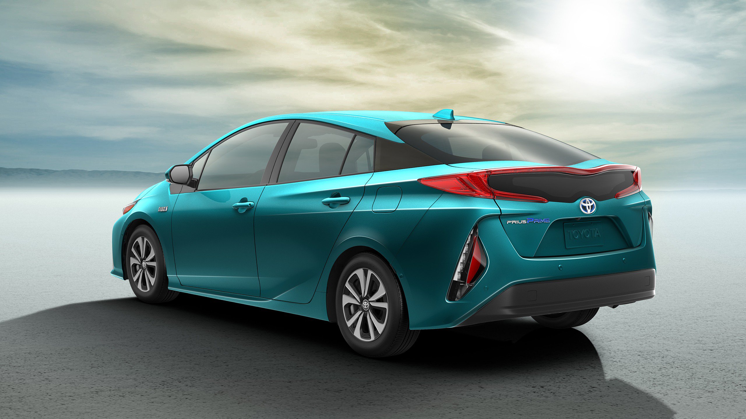 Description: A blue car parked on a beach under a cloudy sky with a sunbeam in the background and a blue sky with clouds.