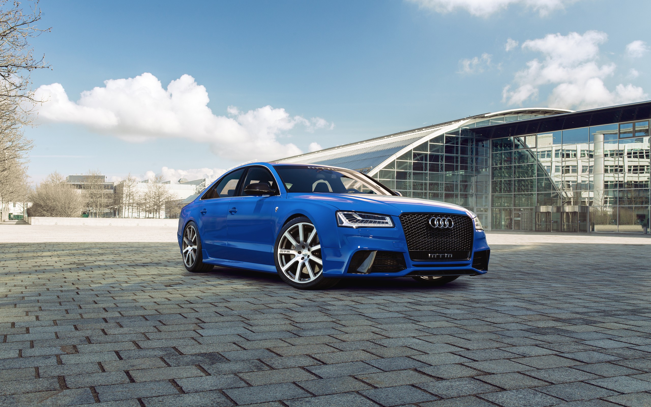Description: A blue car parked in front of a building with a sky background and clouds in the background.