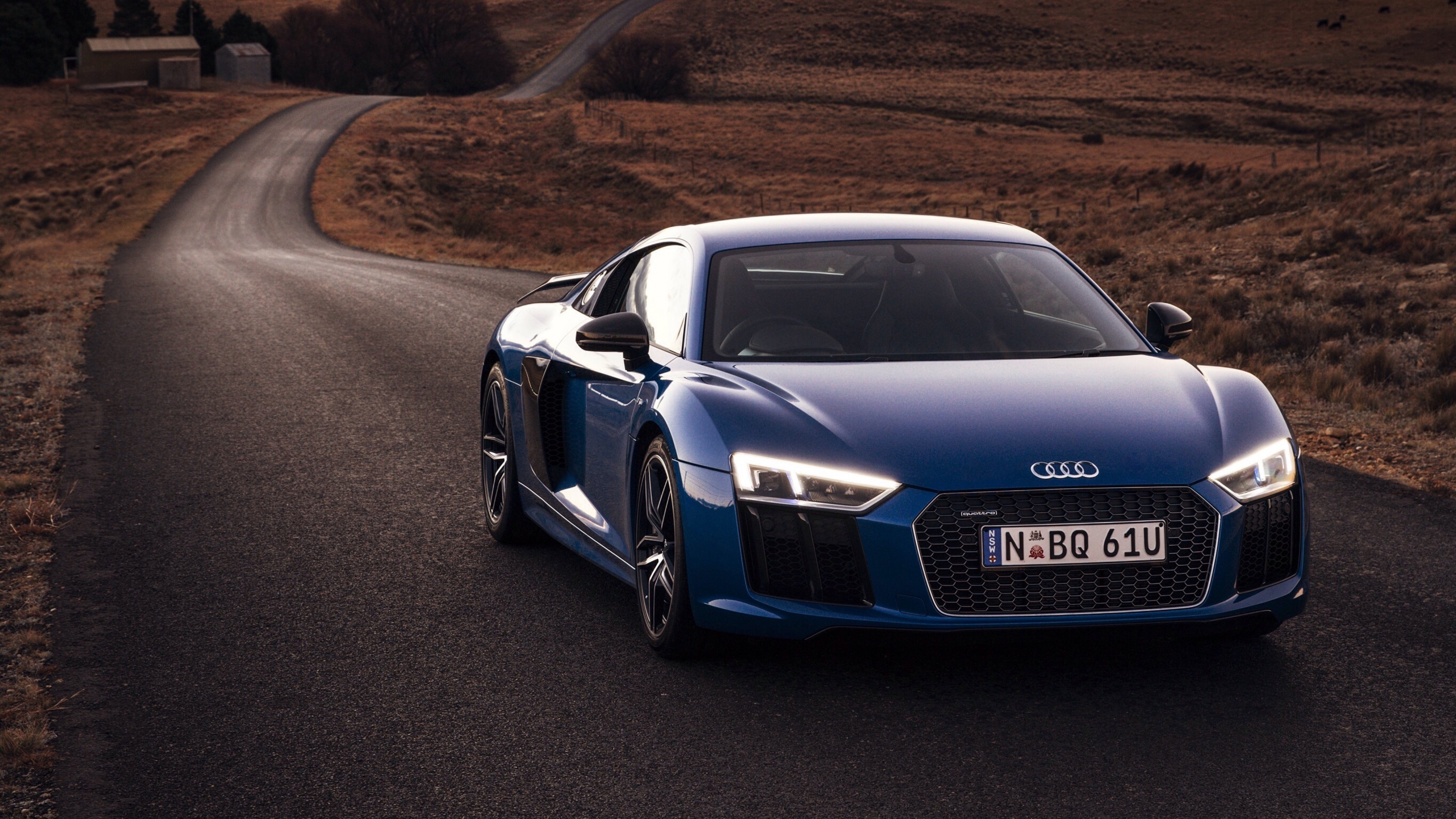 Description: A blue car driving down a road next to a field and a hill in the background with a sign on the front.