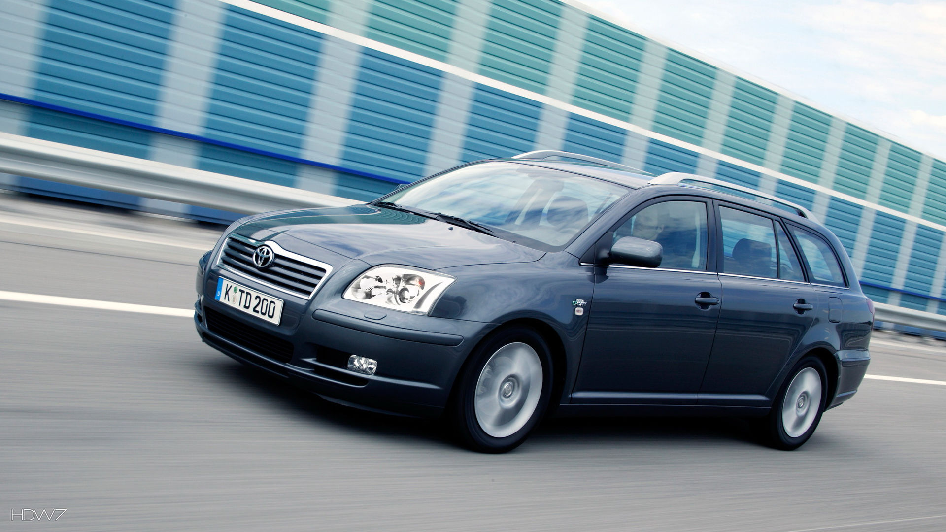 Description: A blue car driving down a street next to a building with a blue sky in the background and a blue sky in the foreground.