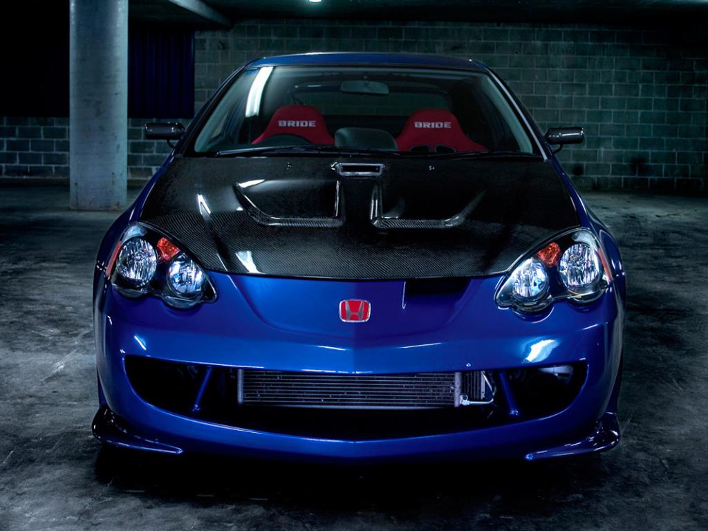 Description: A blue car parked in a garage with its hood up and lights on and a brick wall behind it.