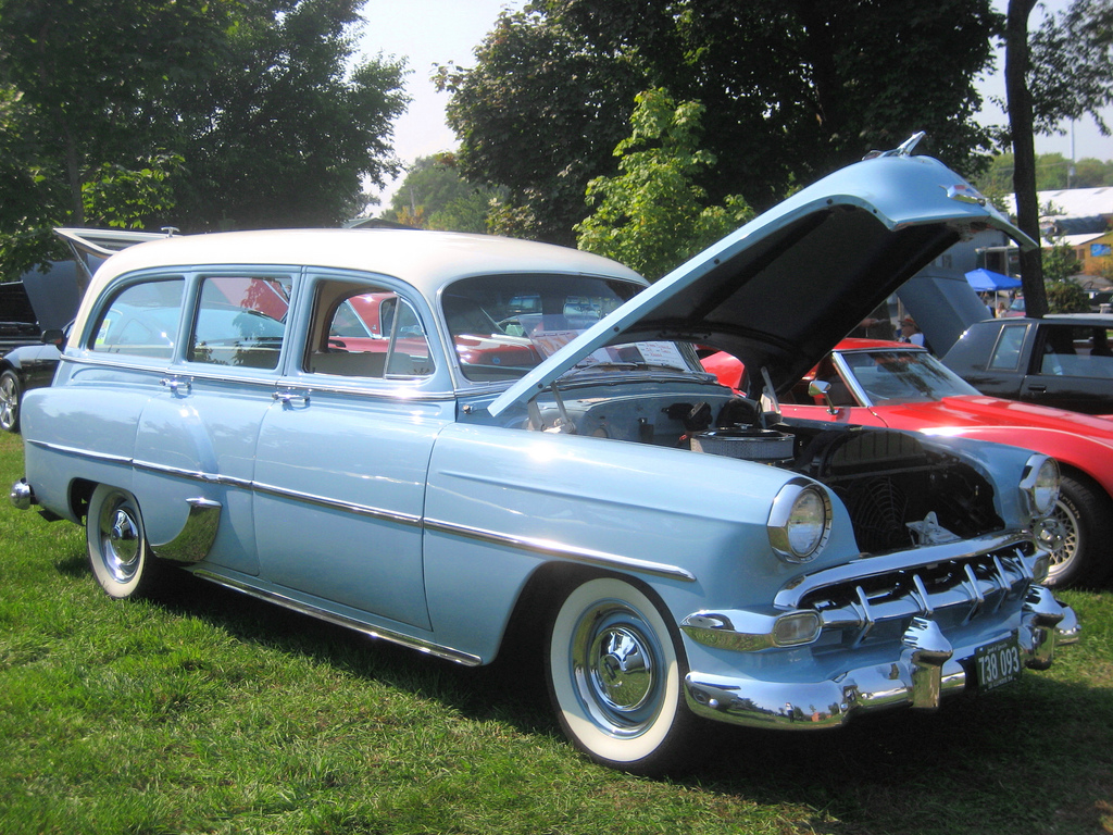 Description: A blue car with a hood open sitting in the grass next to other cars in a field of grass.