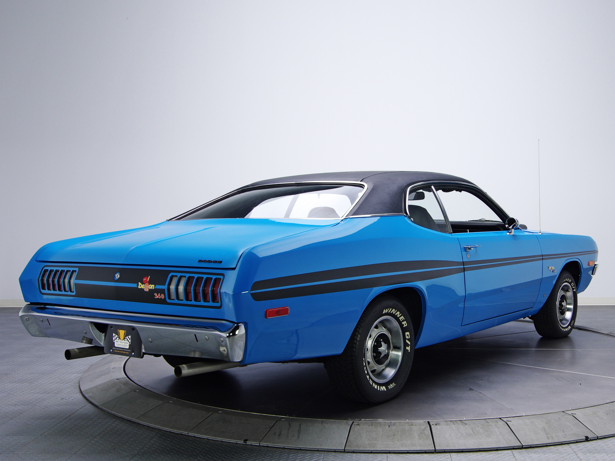 Description: A blue car is on display in a museum room with a white wall behind it and a black and white stripe on the hood.