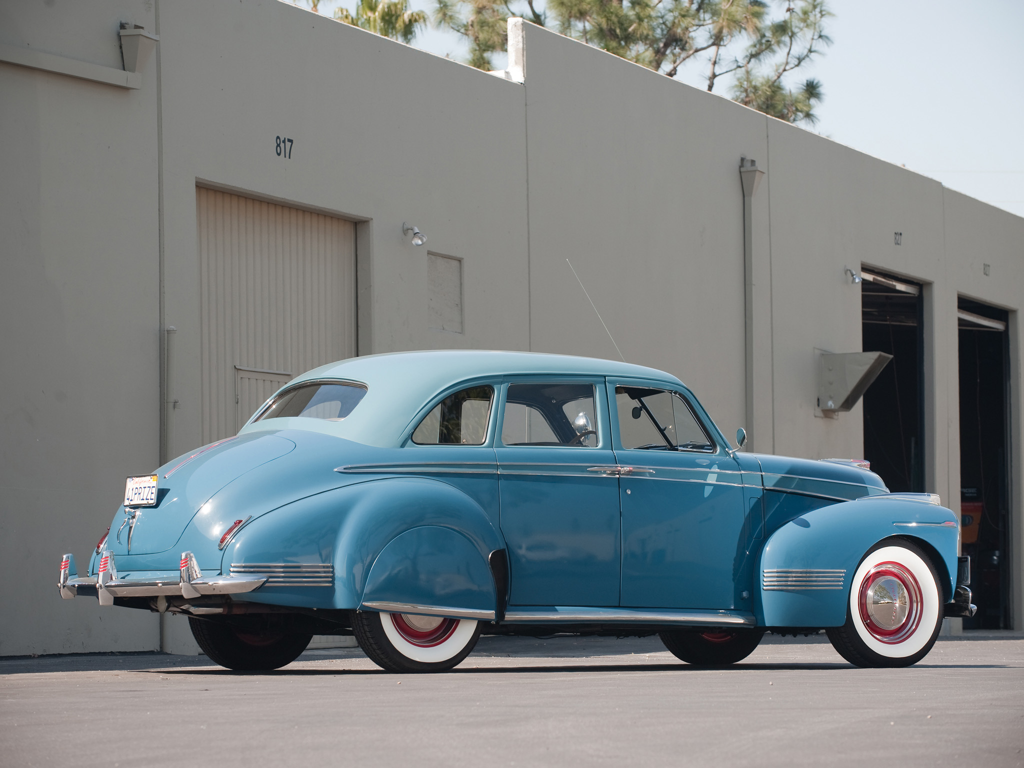 Description: A blue car parked in front of a building with a garage door open and a man standing next to it.